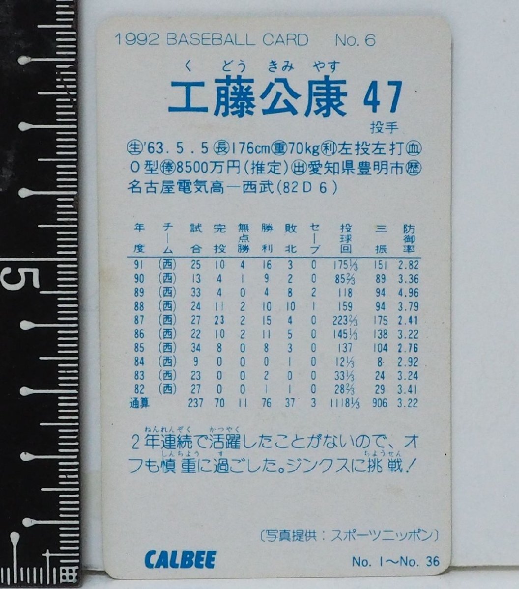 92年 カルビー プロ野球カード No.6【工藤 公康 投手 西武ライオンズ】平成4年 1992年 当時物 Calbeeおまけ食玩BASEBALL【中古】