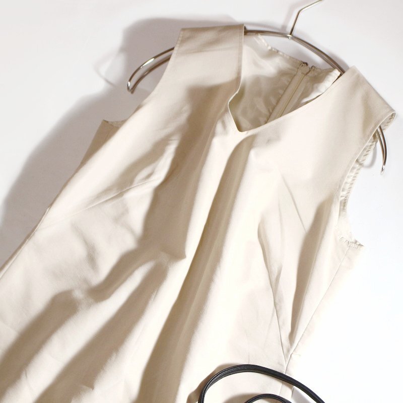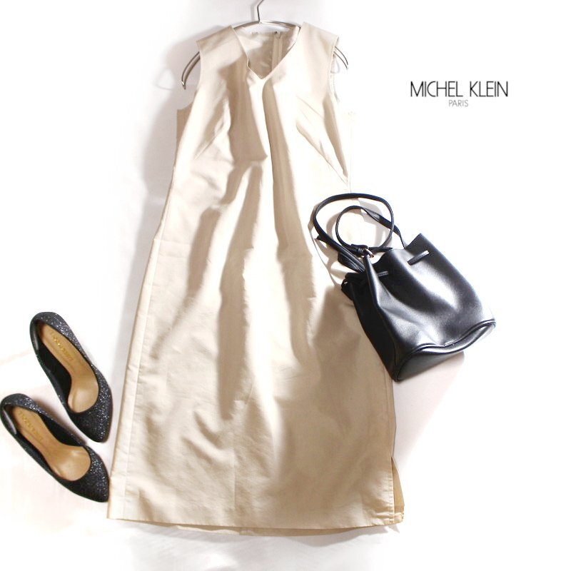 美品 ミッシェルクラン MICHEL KLEIN 春 夏 フォーマル Vネック ハリ 艶 ノースリーブワンピース 9号 38 ベージュ 結婚式 シンプル 無地