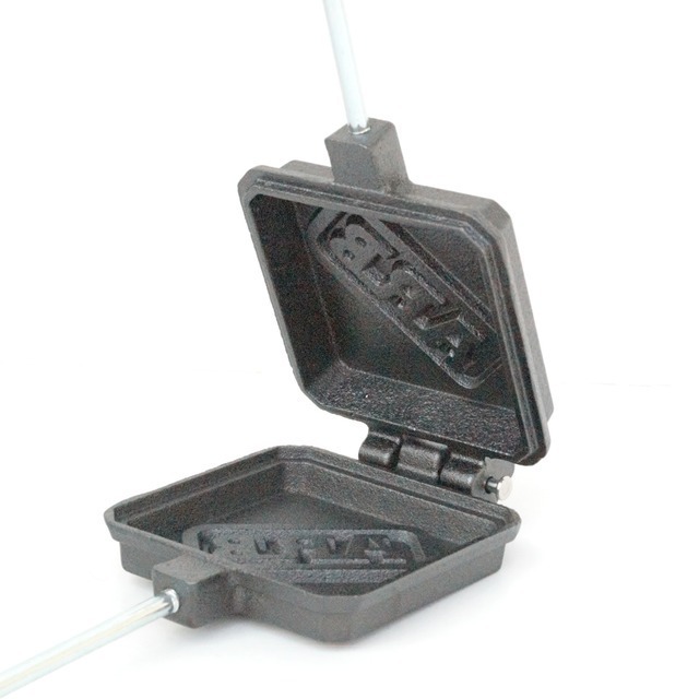 焚き火やガスコンロで本格ホットサンドを楽しめる鋳鉄製サンドメーカー。2枚の鋳鉄プレートでパンをしっかり密閉し、具材を逃さずアツアツに仕上げます。しかも表裏にARBロゴが焼き印され、アウトドア気分をさらに盛り上げます。一般的なモデルよりも頑丈なヒンジ、大径ハンドルロッド、長めの木製ハンドルを採用し、安全性と耐久性を確保。サイズは約620×110×40mmで市販の食パンに対応。シーズニング済みで届いてすぐ使用可能。使用後は洗剤を避けて水洗いし、定期的なオイルコーティングで長く愛用できます。収納バッグ付きで持ち運びにも便利なアウトドア調理器具です。