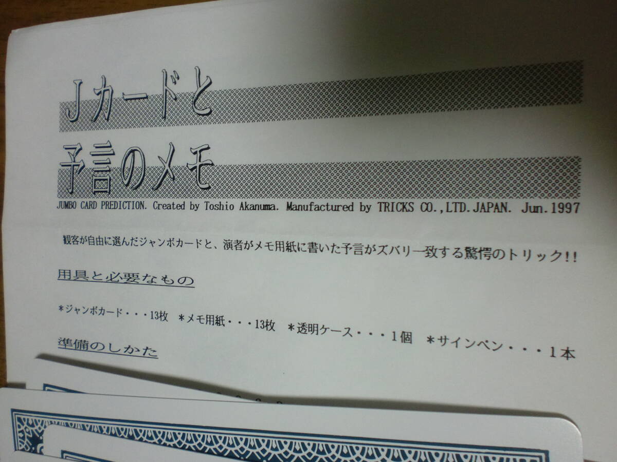 トリックス Jカードと予言のメモ 赤沼敏夫 手品