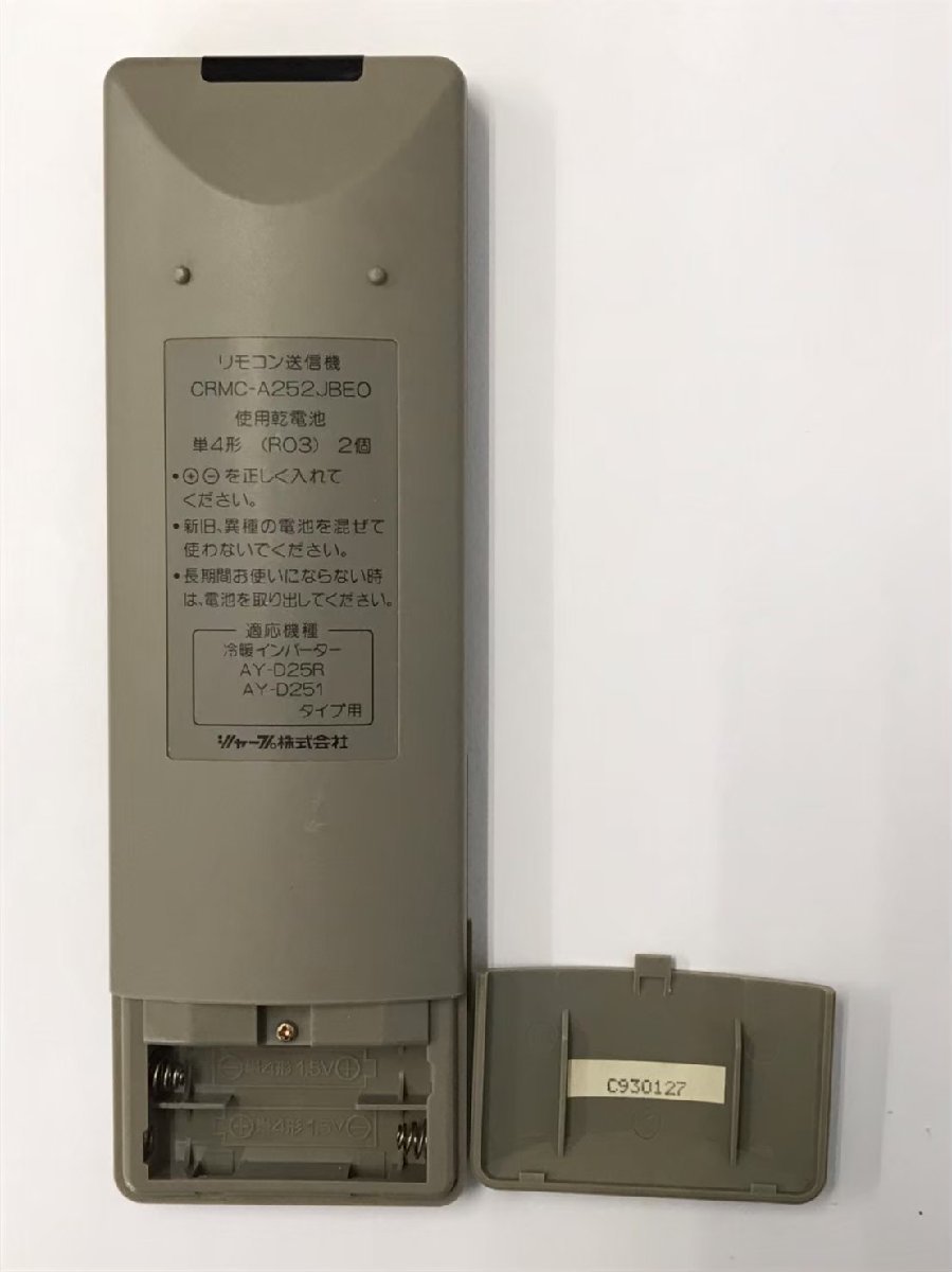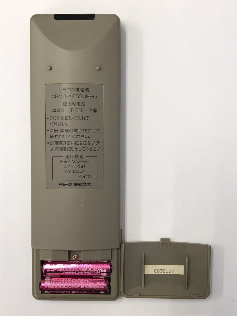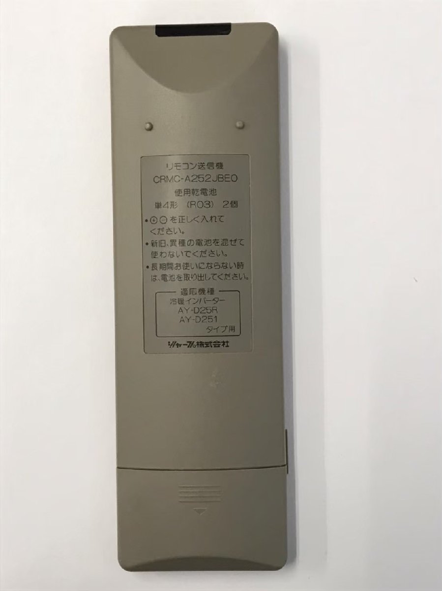 【SHARP CRMC-A252JBEO 電池付き】液晶に小傷あり、裏面に落ちない汚れあり。リモコンのみの販売です。赤外線チェック済です。 すぐお使いいただけるよう電池付き(単4乾電池2個付き)で発送いたします! 電池は接触しないように紙を挟んでおりますので、到着したら引き抜いてからご利用ください。 1点1点専門スタッフが丁寧に検品、できる限りのクリーニングはしておりますが、落としきれない汚れ、ヤケ、キズ、黄ばみ等の劣化はあるものとお考えください。 見た目に関して神経質な方は購入をお控えください。 電池や設定の問題を解決し、使用できるようになっています。 使用できない場合はまずストアにご相談をお願いします。 設定の問題、対応機種間違い、本体側の問題等、リモコンが不良でない場合は保証対象外です。対応機種についてのご質問はお答えできかねます。 各メーカーへお問い合わせいただくか、検索から各機種の取扱説明書をご確認ください。 中古リモコンは現品限りとなりますので、ご希望の商品がございましたらお早めにご購入ください。 ※他店でもこちらと同じ中古リモコンを販売しております。そのため他店でお客様より先に購入があった際は、大変申し訳ございませんがご購入いただいた商品はキャンセルとさせていただきます。あらかじめご承知ください。