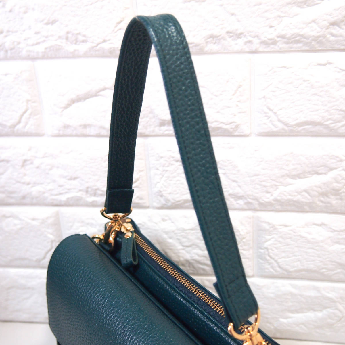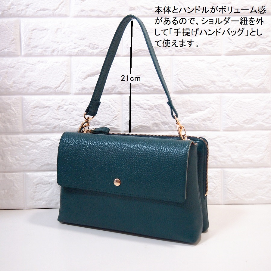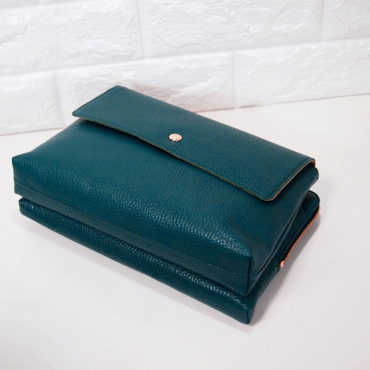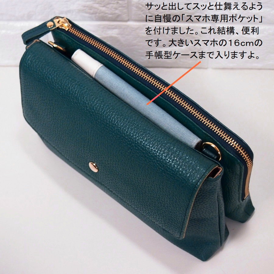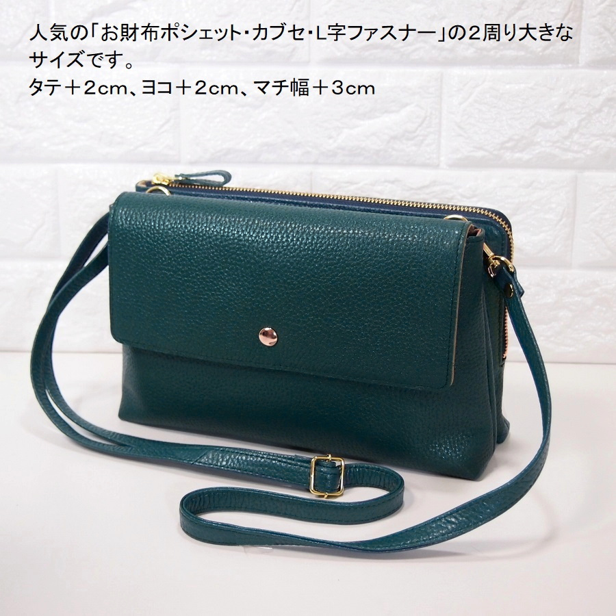 ★ハンドメイド★日本製★本革★お財布ポシェット★カブセ・L字ファスナー・大寸★2WAY★斜め掛けショルダーバッグ★ブルーグリーン色★