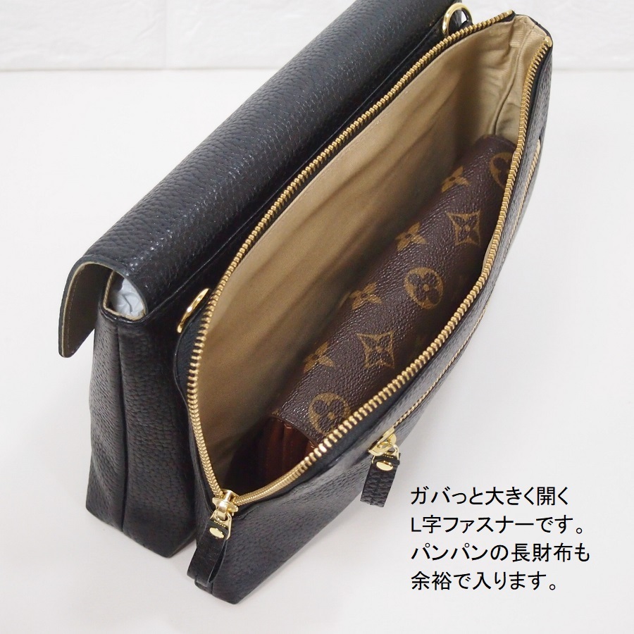 ●L字ファスナーでガバっと大きく開き、出し入れも楽々。実際にお買い上げの方からも、「L字ファスナーがとても使いやすい。長財布もスッポリ収まる。お買い物のときの財布の出し入れのモタツキから解放された。」と多くの評価をいただいております。