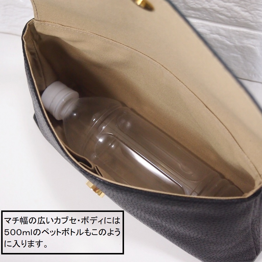 ●マチ幅の広いカブセ・ボディには500mlのペットボトルが横にスッポリと入ります。マチ幅もしっかりあるので、バッグが型崩れすることなく収まります。画像をご確認下さい。