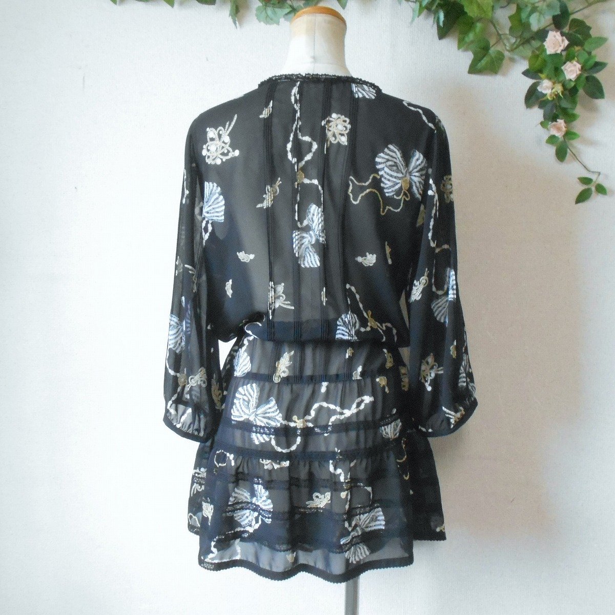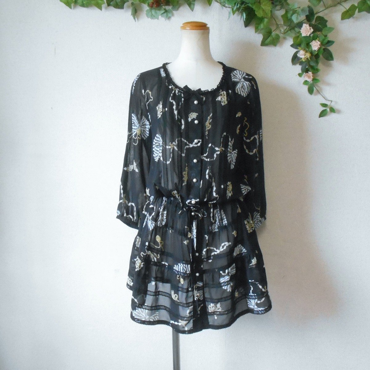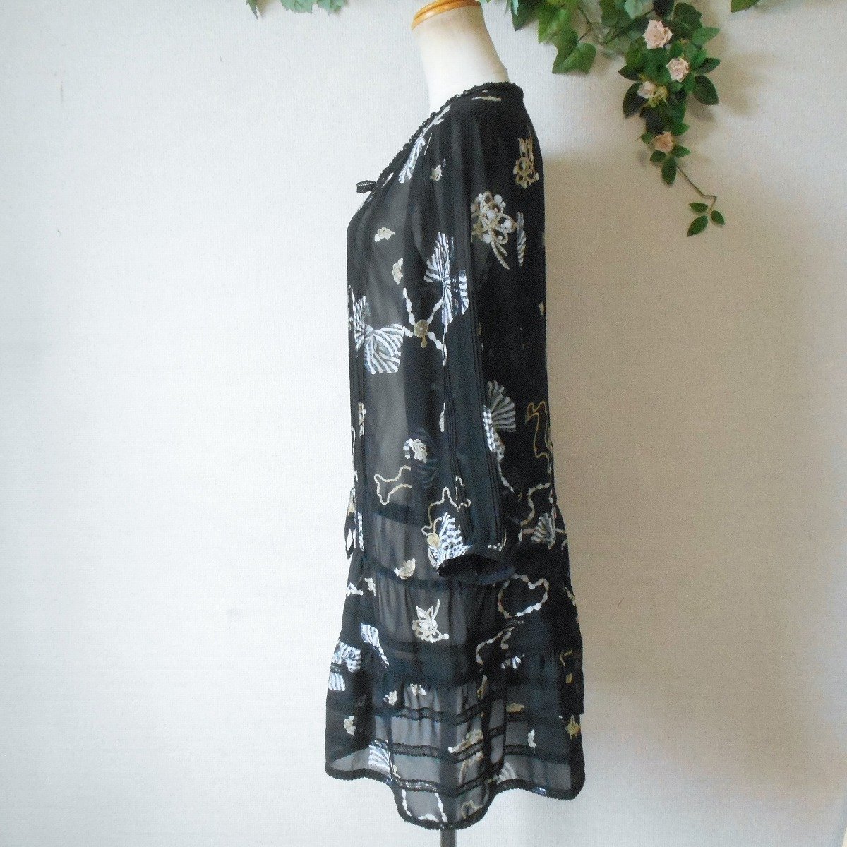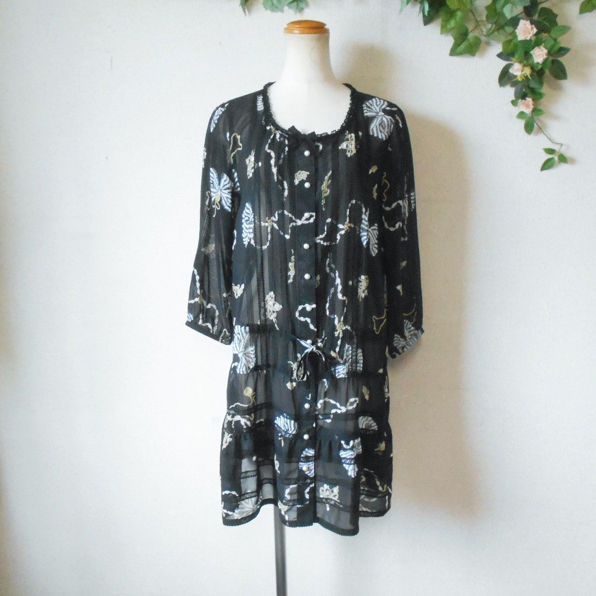 【ポイント】インゲボルグのチュニックワンピースになります。お色は透け感のある黒色ベースでリボンやアクセサリーのプリントが入っています。お袖は7~8分くらいで、ピンタックやレースが使用された、とっても素敵な一着です。