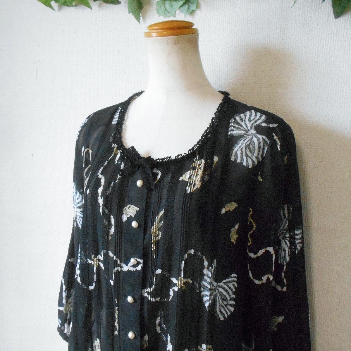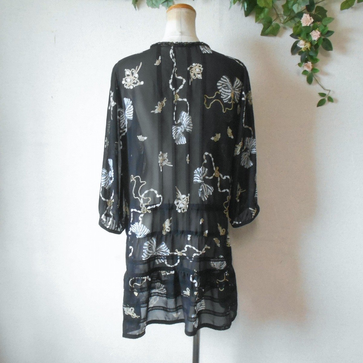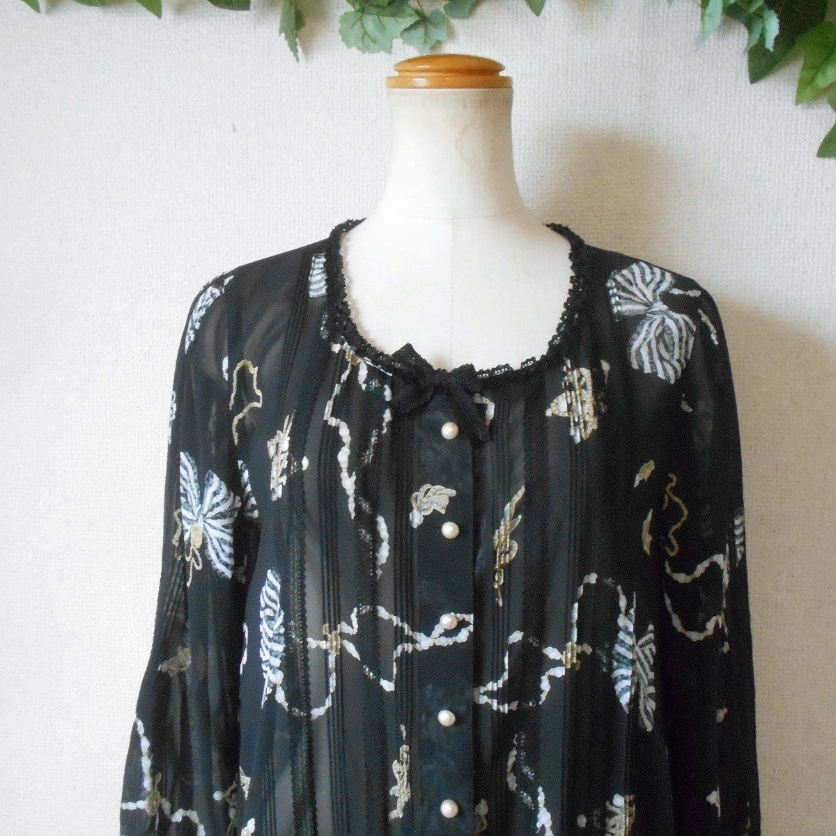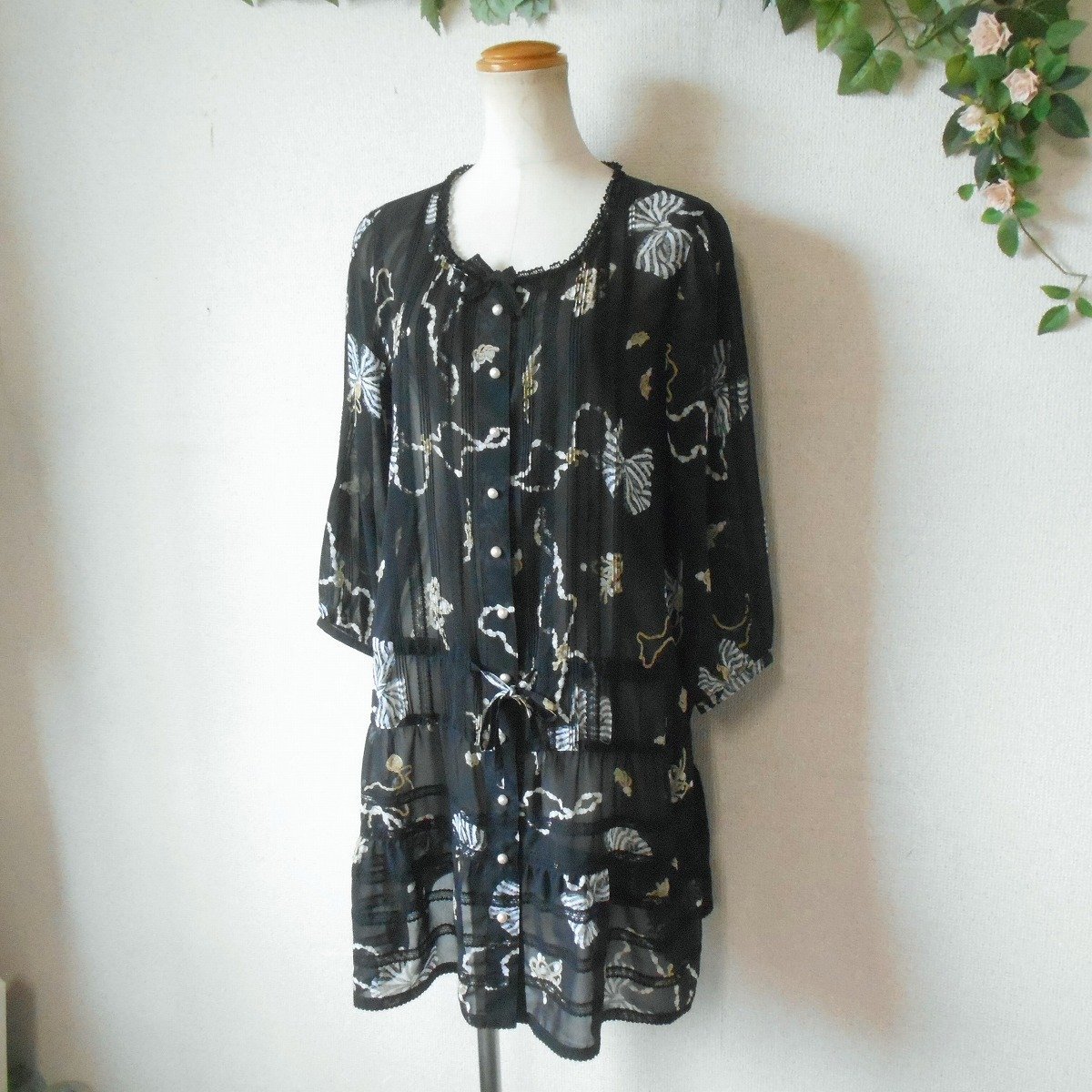 【ポイント】インゲボルグのチュニックワンピースになります。お色は透け感のある黒色ベースでリボンやアクセサリーのプリントが入っています。お袖は7~8分くらいで、ピンタックやレースが使用された、とっても素敵な一着です。