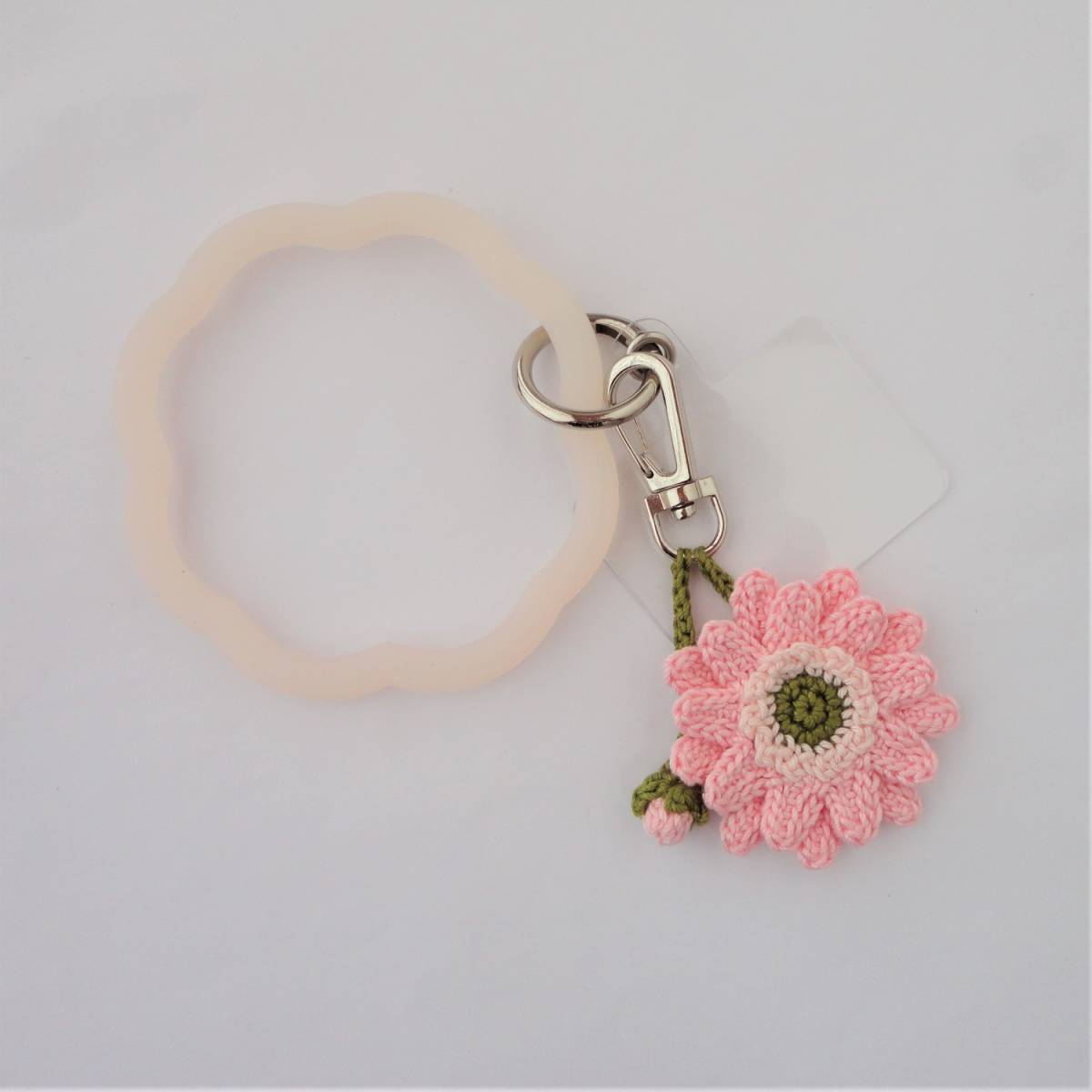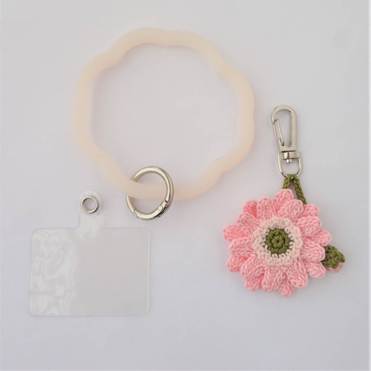 スマホケースにはさむだけ♪スマホハンドストラップ*シリコンストラップ*キーホルダー*ガーベラ*レース編み*ハンドメイド*PK*b405