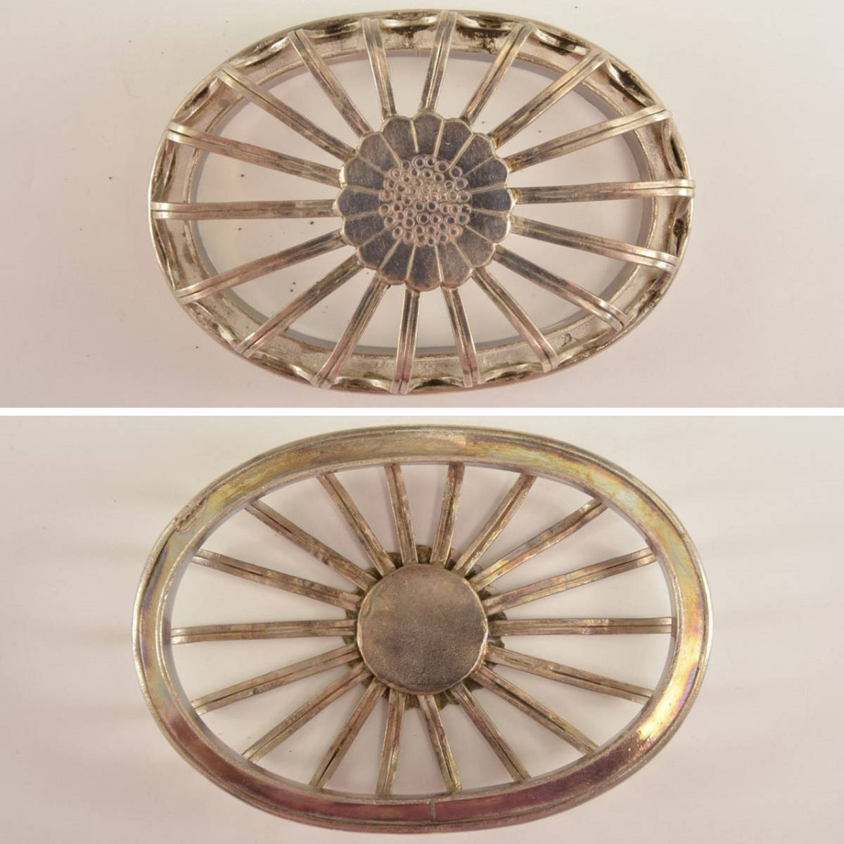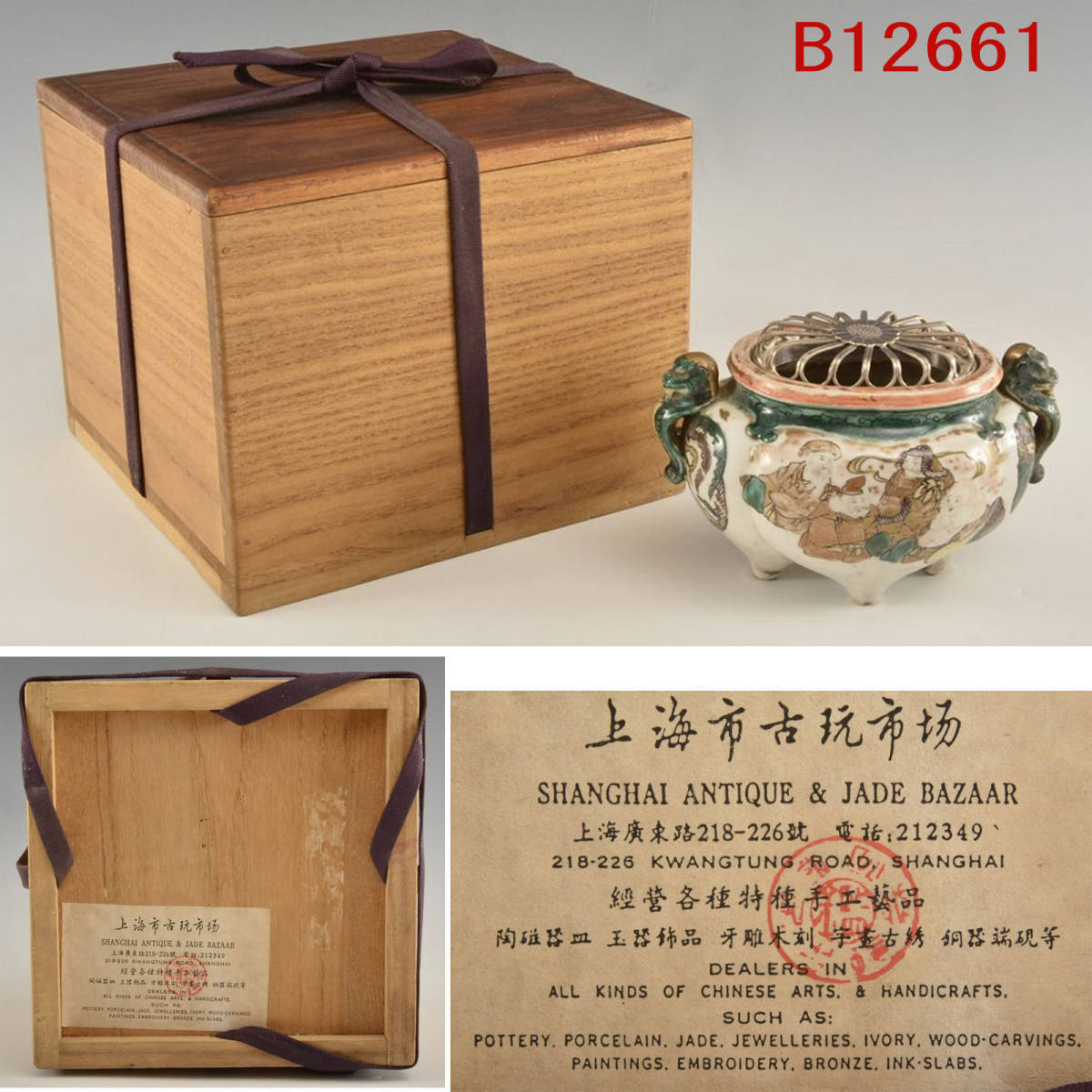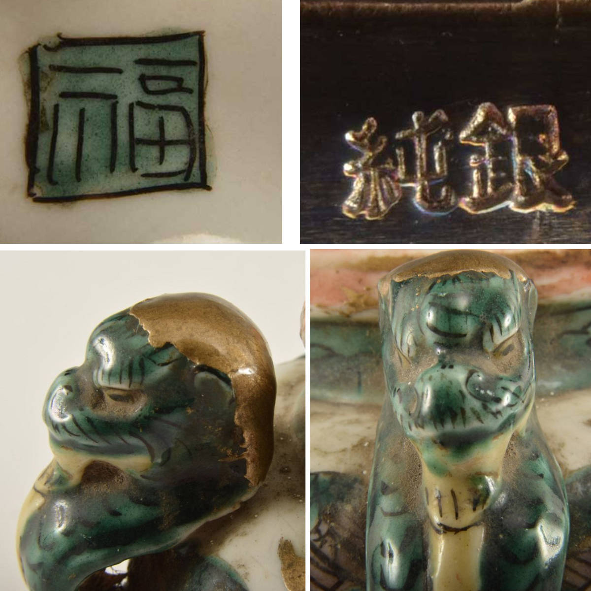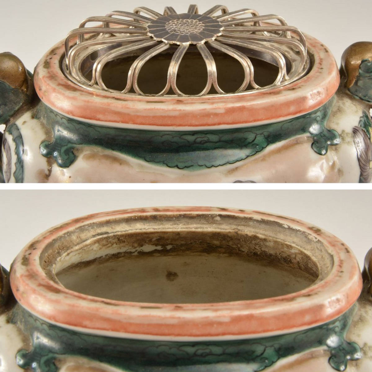 状態:両耳にチップ直しあり。胴に釉薬の取れ2ヶ所。足1ヶ所にチップ1ヶ所。底に「福」とあり。火屋の袴部分に「純銀」の刻印あり。合箱の木蓋に削った部分あり。