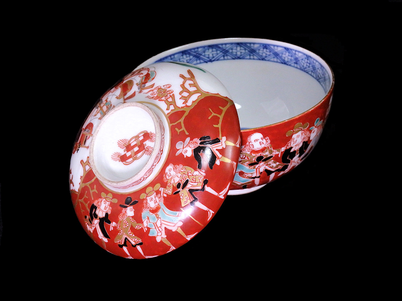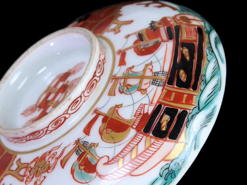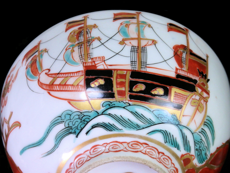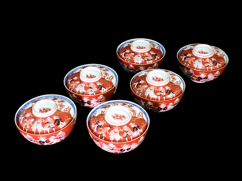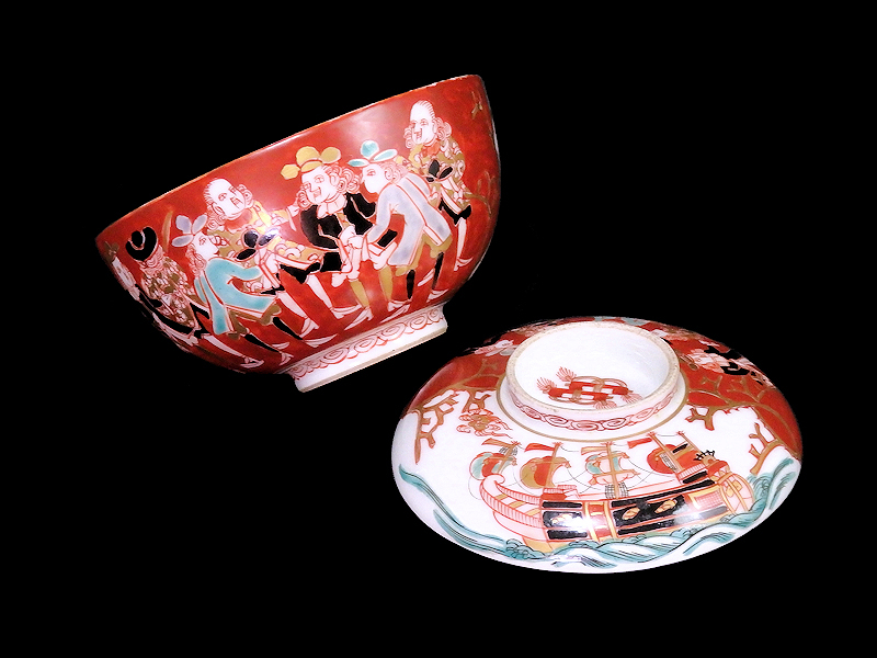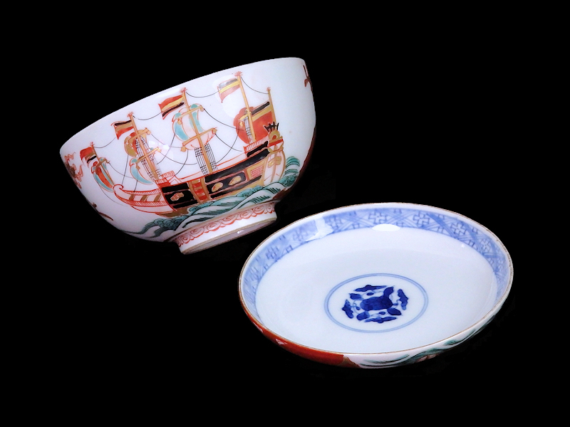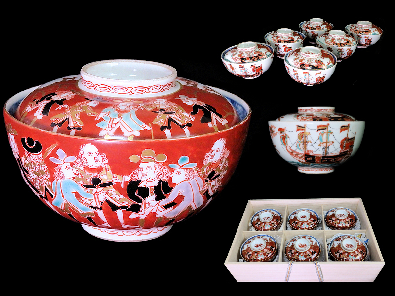 ★華心★ CLm-E678mS 大聖寺伊万里 色絵 五艘船に南蛮人(7人描き)の図 大振蓋茶碗 6客 用心箱付