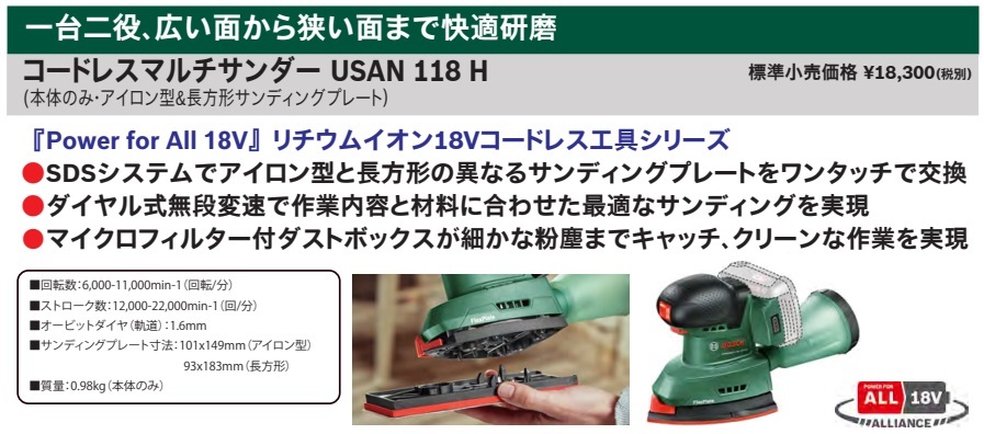 ボッシュ BOSCHコードレスマルチサンダー USAN118H本体のみ・アイロン型&長方形サンディングプレートです。※バッテリ・充電器は別販売品です。『Power for All 18V』リチウムイオン18Vコードレス工具シリーズ■特長・SDSシステムでアイロン型と長方形の異なるサンディングプレートをワンタッチで交換・ダイヤル式無段変速で作業内容と材料に合わせた最適なサンディングを実現・マイクロフィルター付ダストボックスが細かな粉塵までキャッチ、クリーンな作業を実現■仕様・回転数:6,000-11,000min-1(回転/分)・ストローク数:12,000-22,000min-1(回/分)・オービットダイヤ(軌道):1.6mm・サンディングプレート寸法:101x149mm(アイロン型) ・サンディングプレート寸法:93x183mm(長方形)・質量:0.98kg(本体のみ)