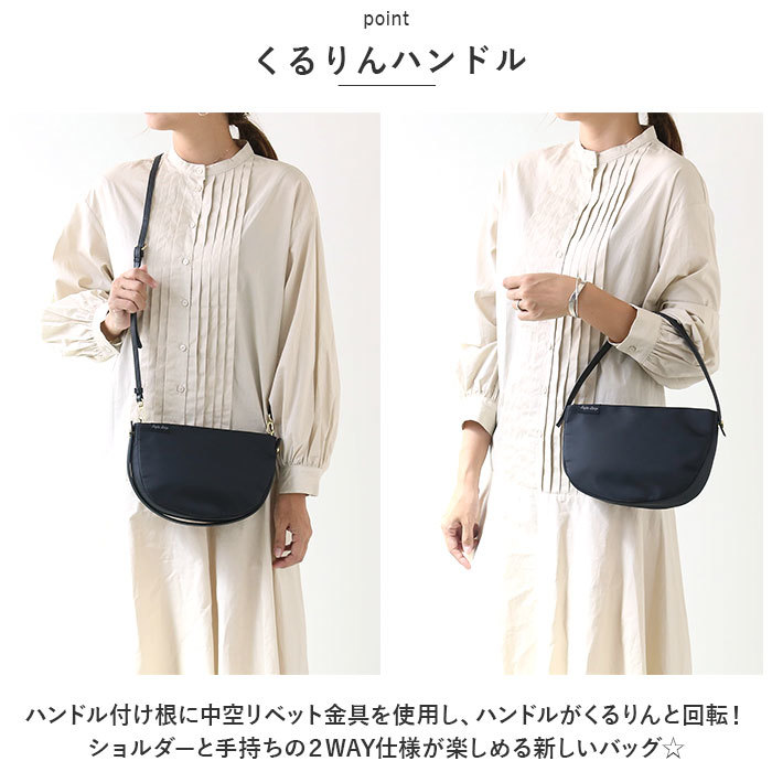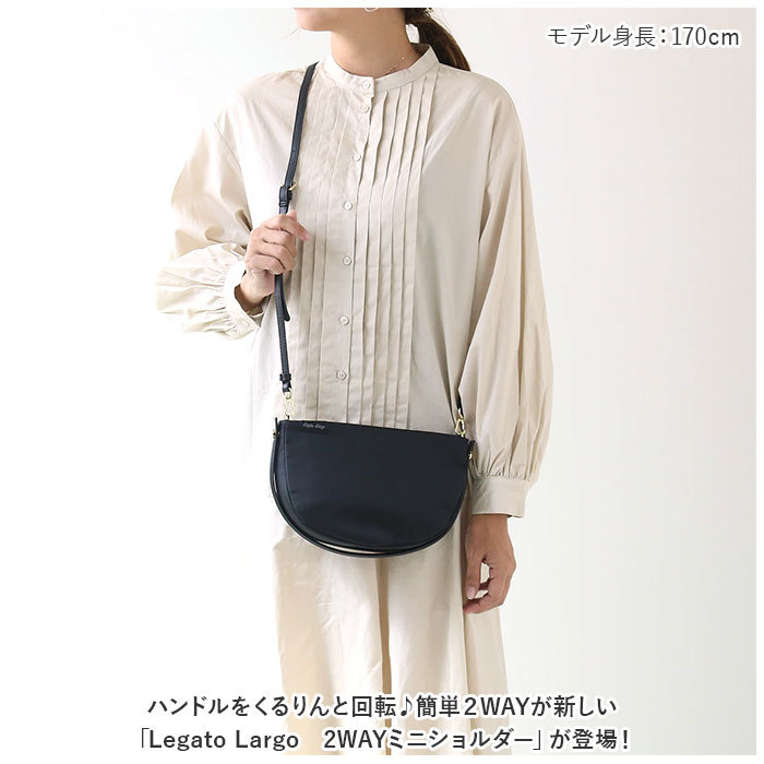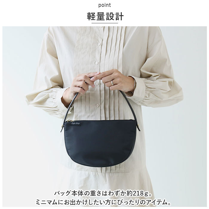 商品説明 | ・・ハンドルをくるりんと回転♪簡単2WAYが新しい「Legato Largo 2WAYミニショルダー」が登場! ・【くるりんハンドル】 ・ハンドル付け根に中空リベット金具を使用し、ハンドルがくるりんと回転!ショルダーと手持ちの2WAY仕様が楽しめる新しいバッグ☆ ・【撥水ナイロン】 ・汚れや水濡れに強い、撥水ナイロンを使用しているので突然の雨でも安心。丈夫なのも嬉しいポイント。 ・【軽量設計】 ・バッグ本体の重さはわずか約218g。ミニマムにお出かけしたい方にぴったりのアイテム。 ・【ハーフムーンデザイン】 ・大人気のデザイン、ハーフムーン型。自立する&広めのマチなど機能面も充実。ショルダー時には持ち手がバッグに沿い、デザイン性もUP☆ ・【長さ調節OK】 ・ショルダー紐は取り外し&長さ調節可能。体型や服装に合わせて調節できるのも嬉しいポイント。 ・【大人シンプル】 ・洋服やシーンを選ばない、大人シンプルなデザイン。カジュアルになりがちなショルダーバッグを上品な印象に仕上がる大人のバッグ。 ・【ポケット仕様】 ・メインルーム:オープンポケット×1 ・背面:マグネットボタン式ポケット×1 |