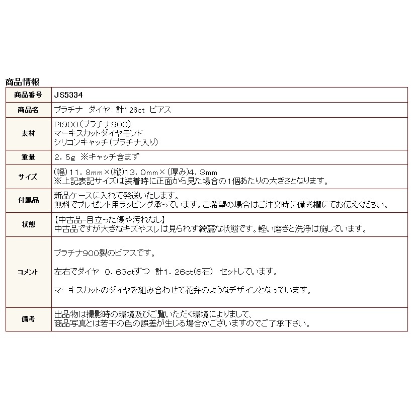 | 素材 | Pt900(プラチナ900) マーキスカットダイヤモンド シリコンキャッチ(プラチナ入り) |