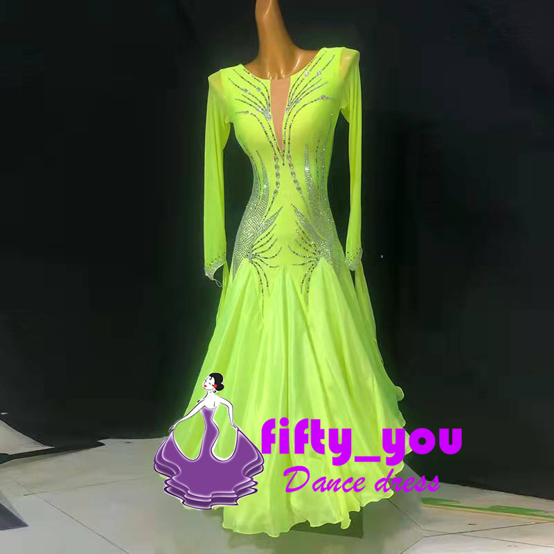 新品fifty_you ワルツ競技豪華ドレス レディース社交ダンス衣装 サイズセミオーダー モダンダンスドレス キラキラライトストーン飾 蛍光緑