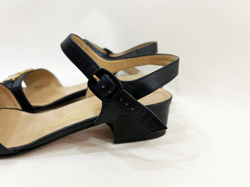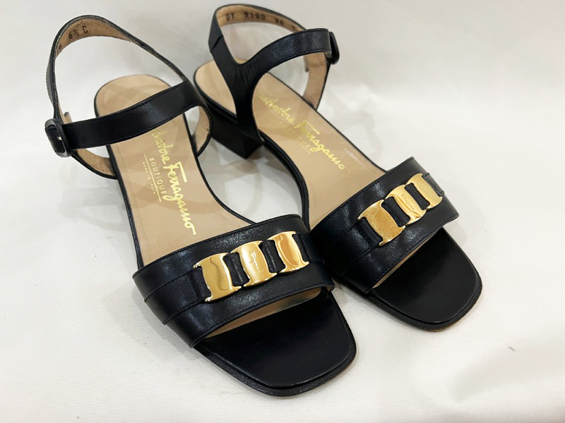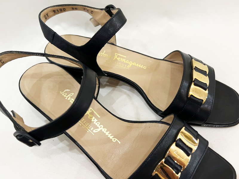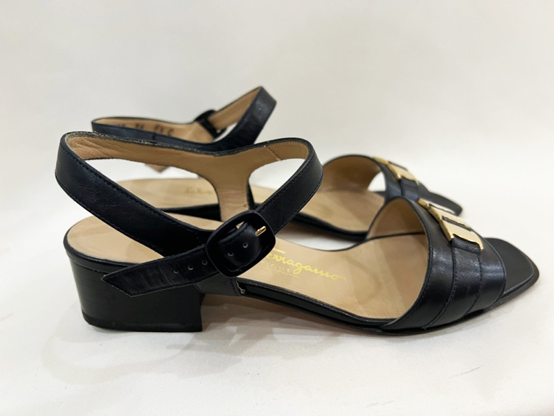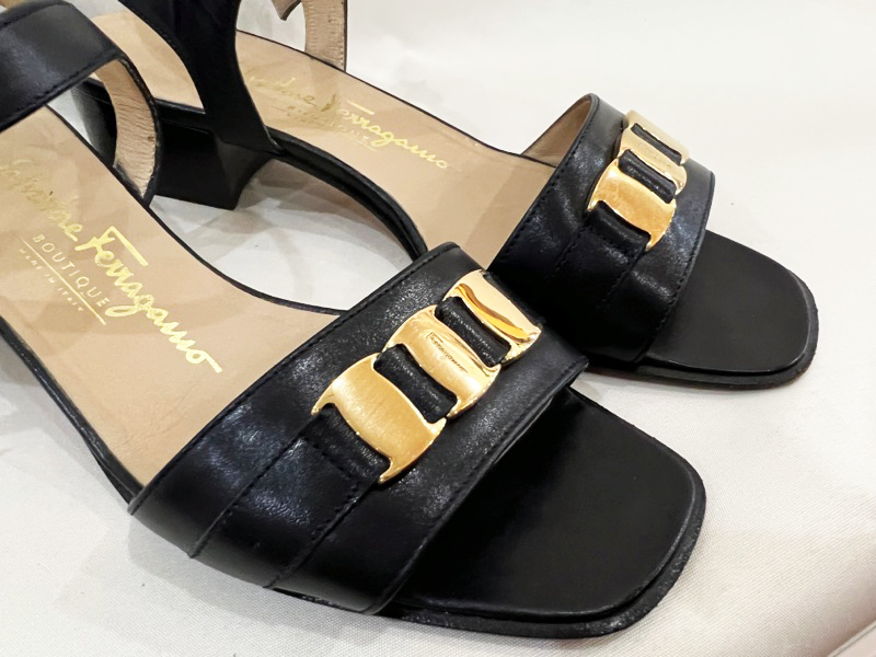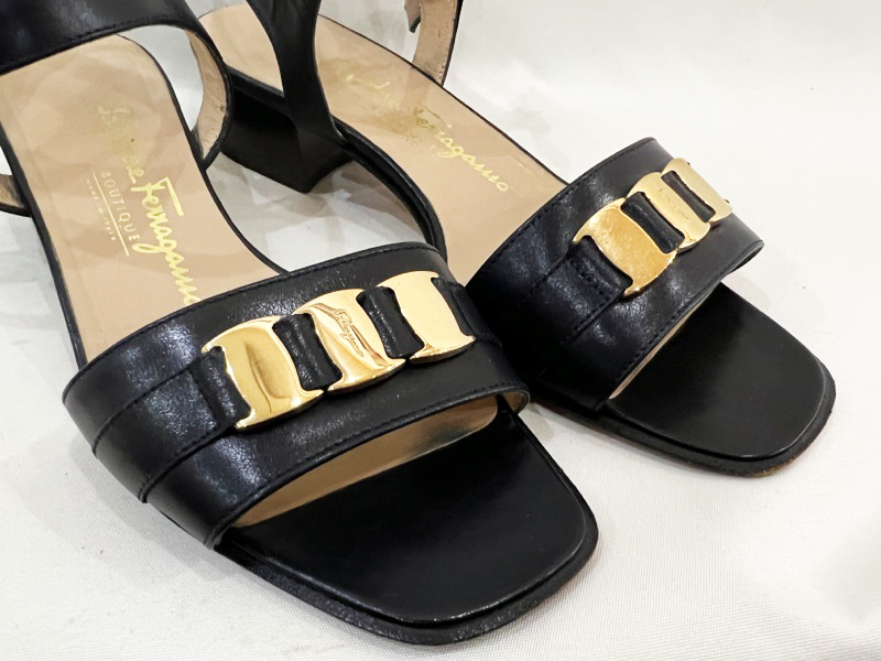 美品 Salvatore Ferragamo BOUTIQUE/サルヴァトーレフェラガモ ヴァラ3連アンクルストラップ サンダル ゴールド×ブラック 6.5(23.5cm)