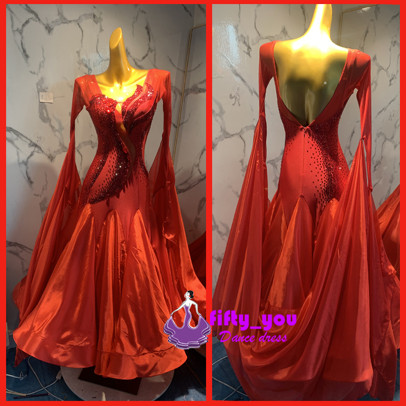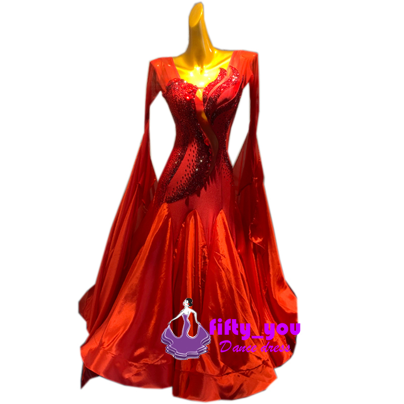 新品fifty_youモダン競技豪華ドレス レディース社交ダンス衣装 サイズセミオーダー ワルツドレス ライトストーン飾り レッド 高級品