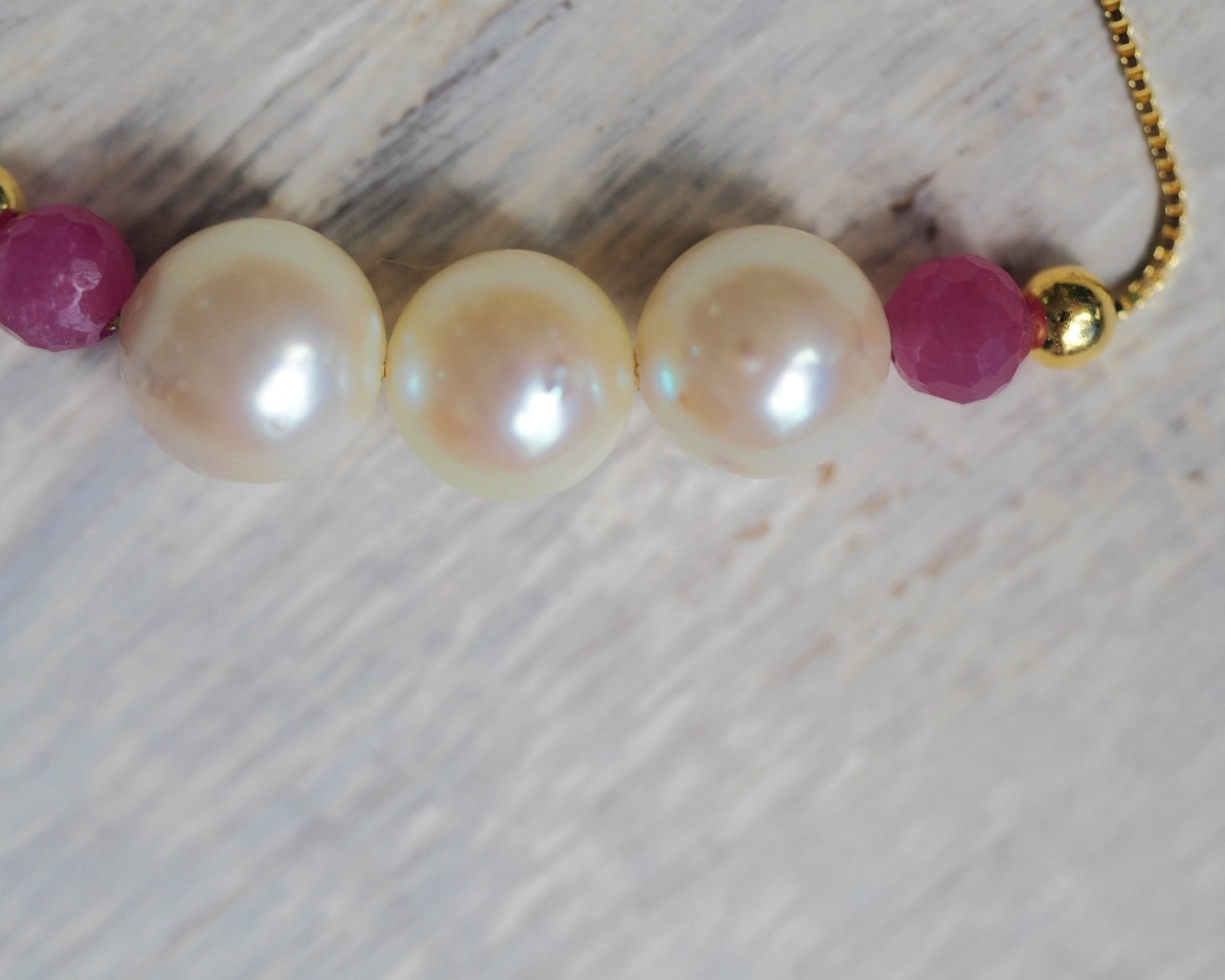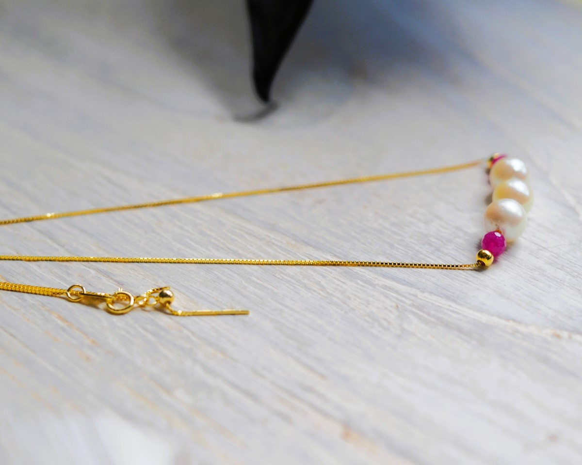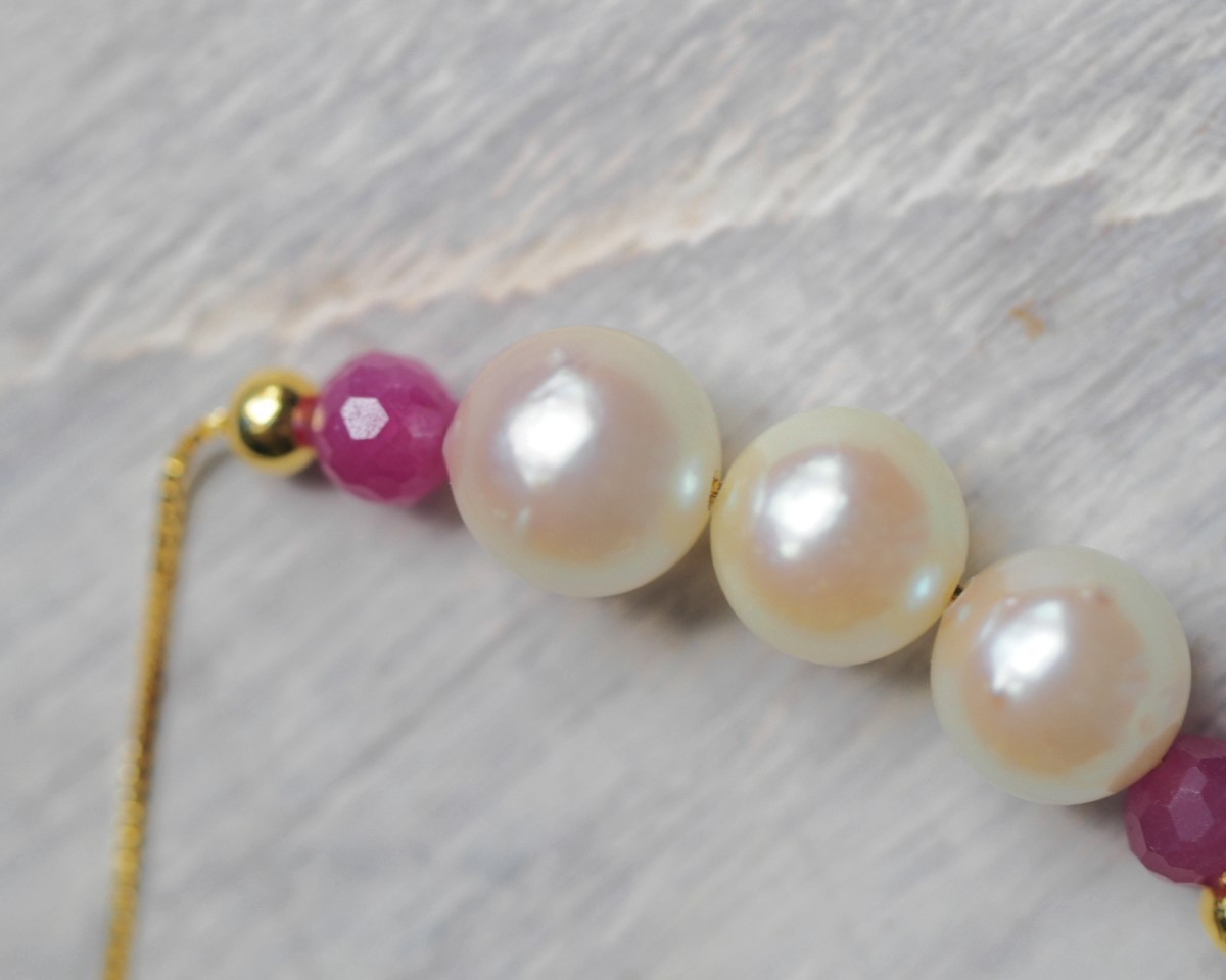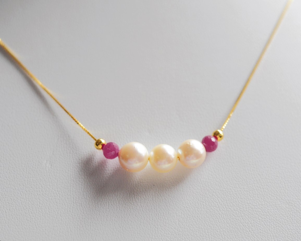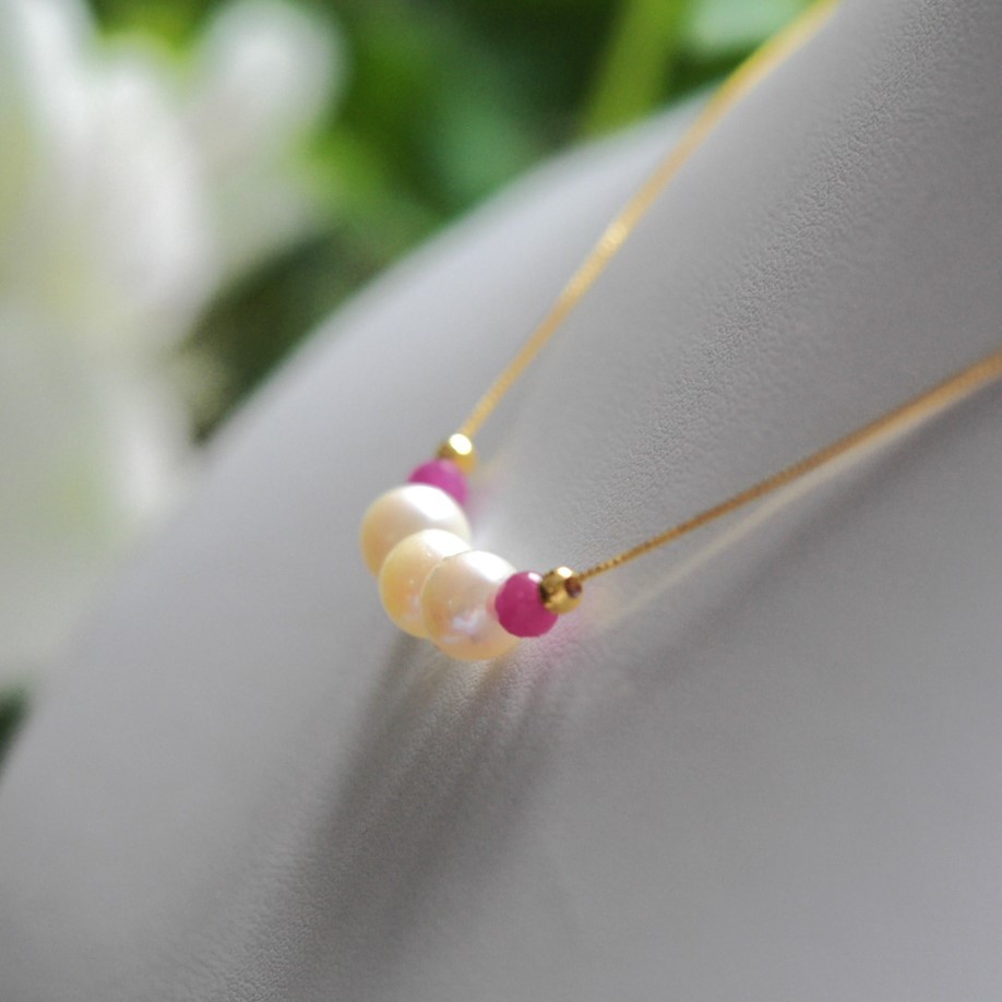 パープルレッドのルビーとアコヤ真珠のチェーンネックレスです。