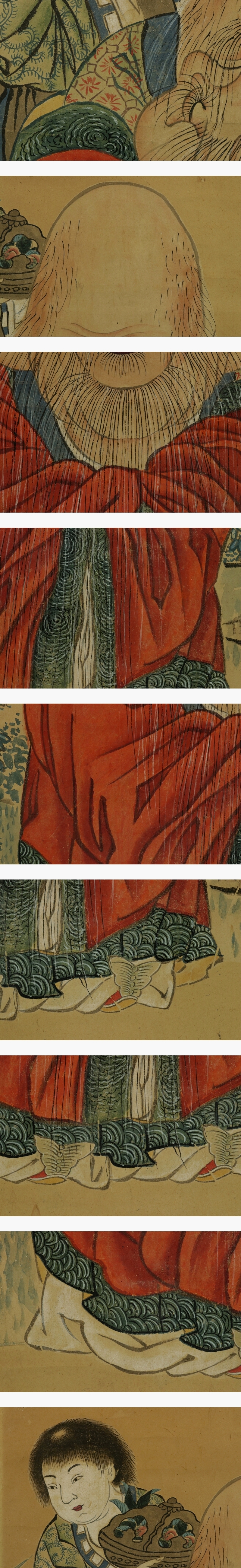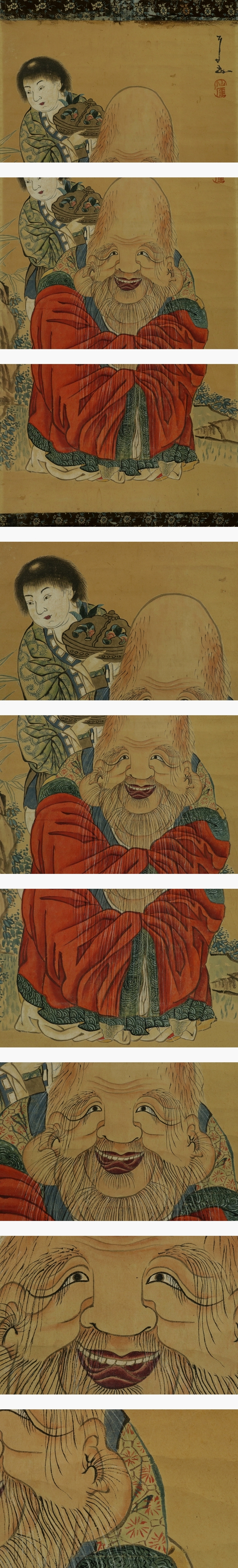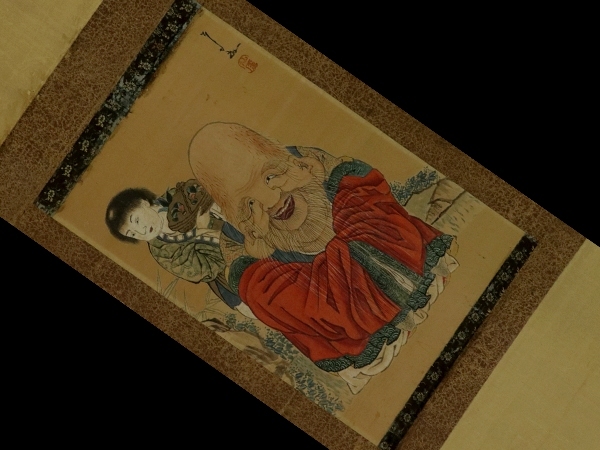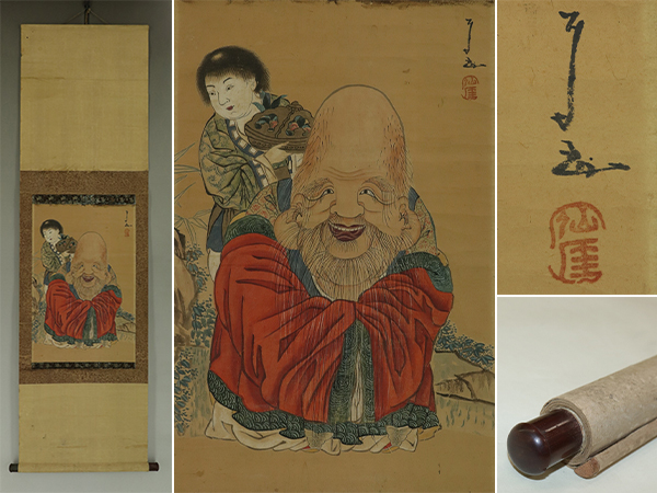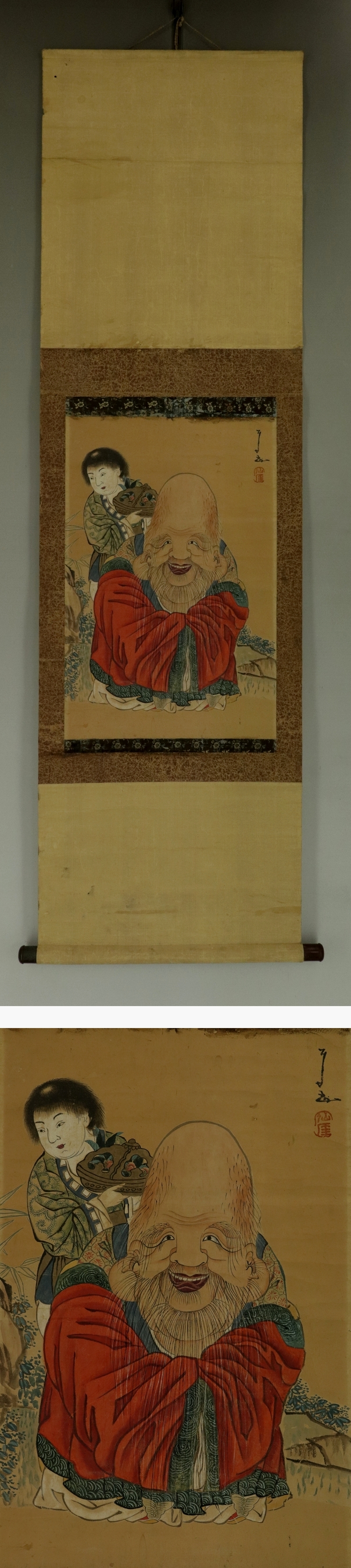 仙厓義梵 せんがい-ぎぼん(1750-1837) 江戸時代の臨済宗古月派の禅僧、画家。 美濃国武儀郡で生まれ、11歳の頃清泰寺で臨済宗の僧となった。 19歳になり行脚の後に月船禅彗の門下に入る。 39歳より博多の聖福寺の盤谷紹適の法嗣となる。 仙厓の絵は生前から人気があり、一筆をねだる客が絶えなかった。 83歳の時、庭に「絶筆の碑」を建て断筆宣言をしたが結局やめられず、没年まで作品は残っている。 本紙は、染み、汚れ、強い折れ、強い皺、虫食い、擦れ、ヤケ、時代感があります。 表装は、染み、汚れ、強い折れ、強い皺、虫食い、破れ、くすみ、擦れ、 軸先に汚れ、軸紐に劣化があります。 【サイズ】 作品 横約36cm×縦約55cm 表装 横約45cm×縦約156cm |