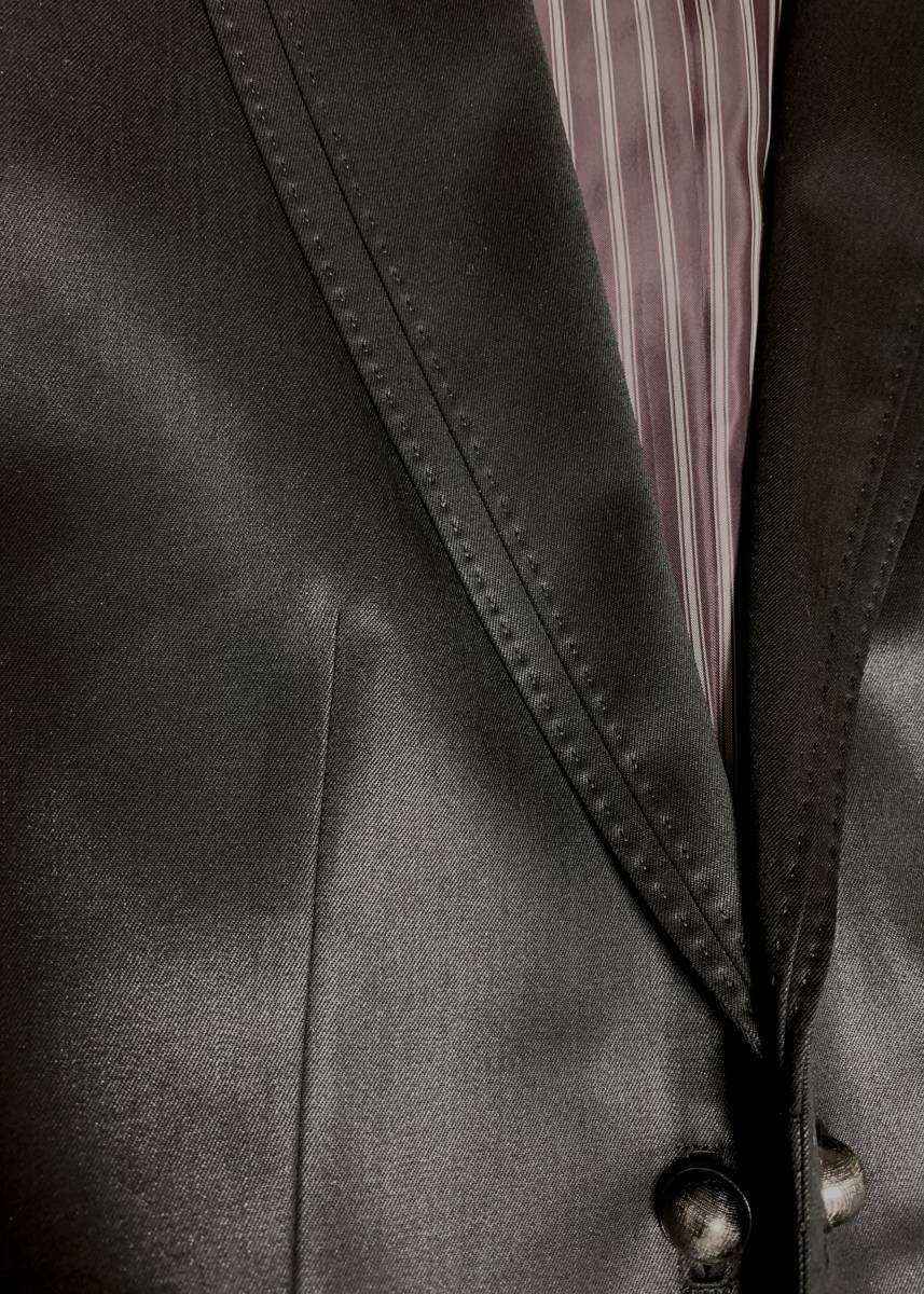 (画像3枚目) トルソーの肩幅よりもジャケットの肩幅のほうが少し小さいため掲載画像で確認できるように、画像では少し肩の部分が浮いてしまっていますが実物は縫製など問題なく、記載の肩幅くらいの方でしたら綺麗にご着用いただけます。