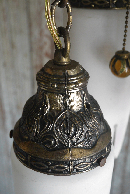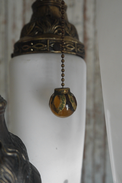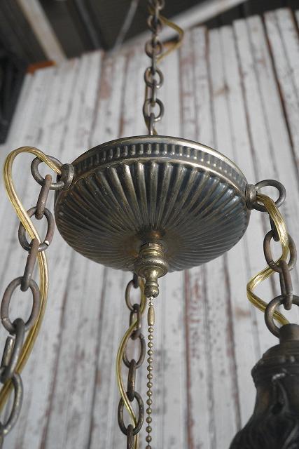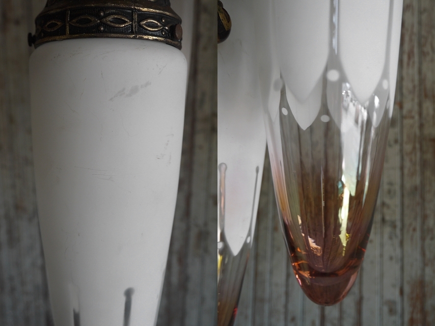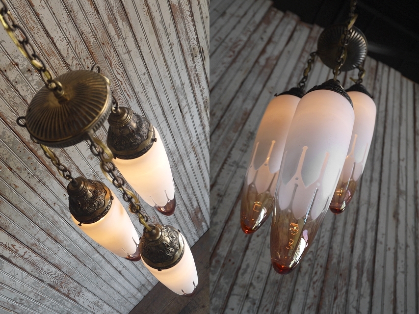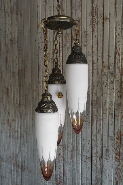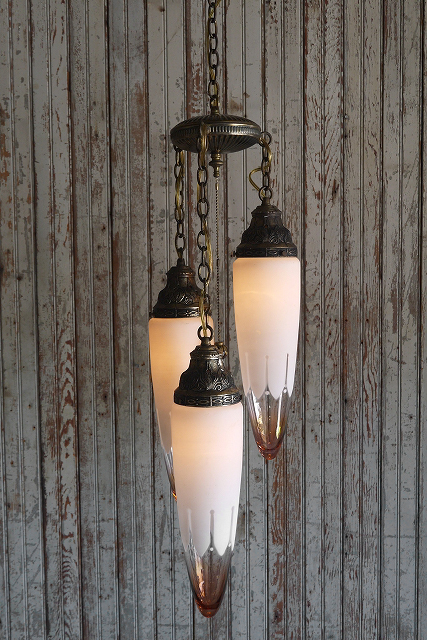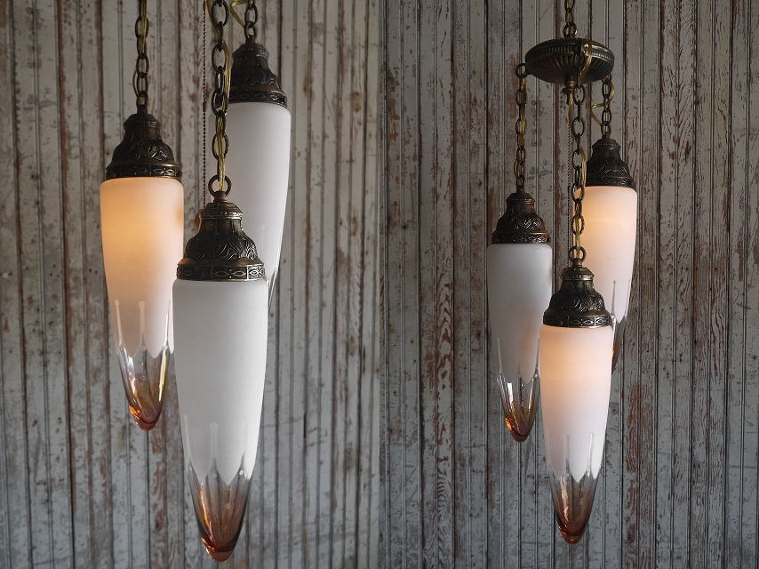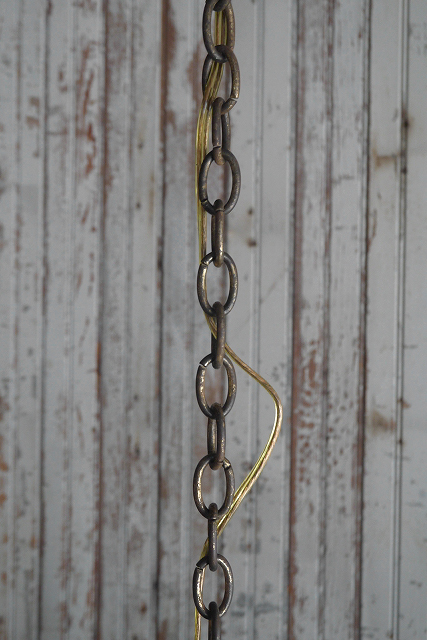 | 商品説明 岡山STAGEより出品します。アメリカで買い付けたアンティークの3連吊り下げランプです。3層に加工されたガラスシェードが連なった大変希少なランプです。シェードからこぼれる優しい灯りと、メタルベースからのバランスが光の演出を際立てています。3連が織りなす輝きはとても良い雰囲気がありますので天井高のある場所や吹き抜け等にもおすすめです。電球は付属しませんが市販のE26mm口径の一般的なタイプですのでご用意ください。引っ張りスイッチ仕様になり点灯切り替えが可能です。状態ですが、画像にもあるようにシェードに小傷や擦れや汚れ、上側の縁に細かい欠け(カップで見えなくなります)ございます。その他、経年による金属劣化や錆、汚れ、多少の歪み等はございますが雰囲気を損なうようなダメージはなくアンティークならではの良い状態かと思います。あくまでアンティークになりますのでご理解いただける方のご購入をよろしくお願い致します。 サイズ 全高約75cm、直径約23cm、ランプ1個の直径約10cmです。 予定発送方法 保障の利く佐川急便の元払い160cmサイズ料金で行います。 コメント コンセント式ですので別途735円でシーリング式への交換と長さ調節もいたしますのでお気軽にご相談ください。(現状チェーンは約80cmです。切り縮めは無料、延長の場合は要相談)店頭でも販売しております。タッチの差で売れた場合はご了承下さい。■落札後の連絡及びご質問の返答は基本的に午前10時~午後6時までとさせて頂きます。毎週水、木曜日、年末年始や時間外でのご連絡は休み明け及び翌日のご連絡となりますので予めご了承下さい。 STAGEホームページ https://stage-stage.ocnk.net// |