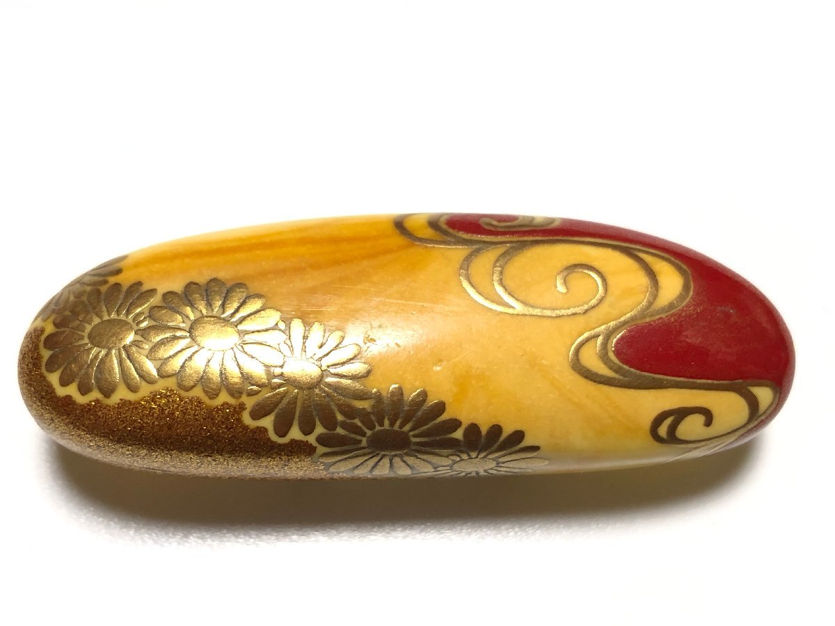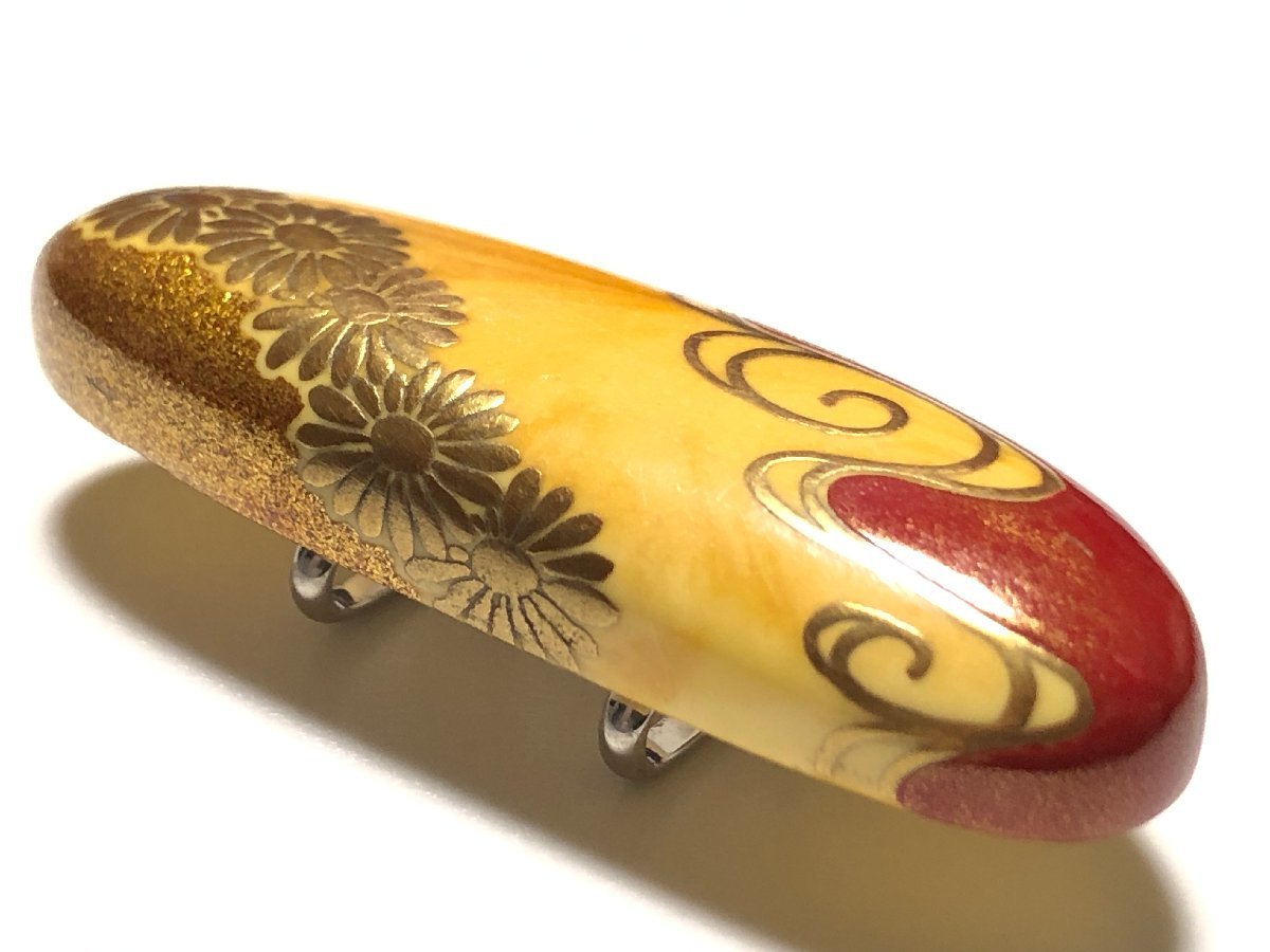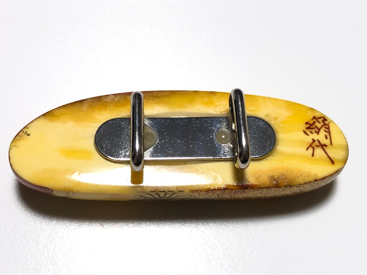 アンティーク、うるしアートはりや(HARIYA) のロイヤルアンバーを使用した、菊文の帯留めです。作者、針谷絹代の銘があります。状態良好です。