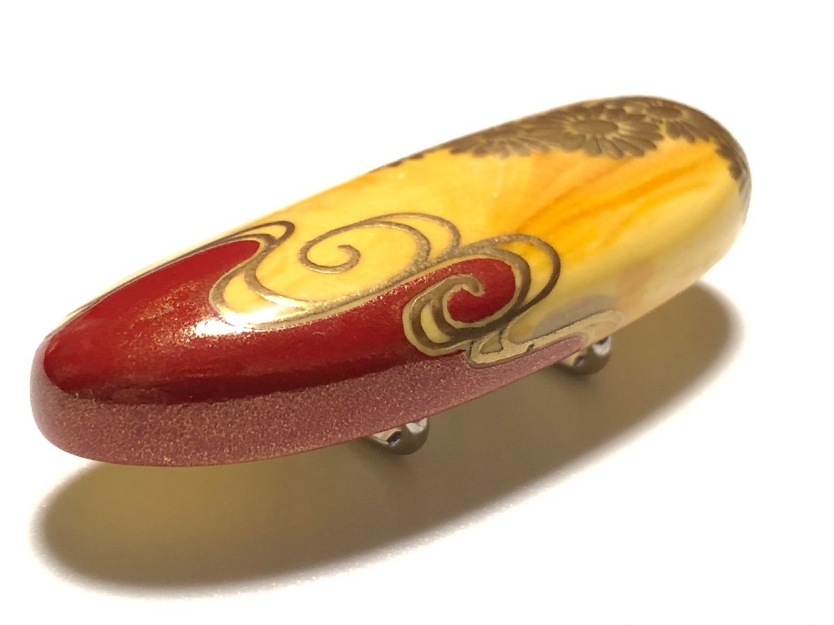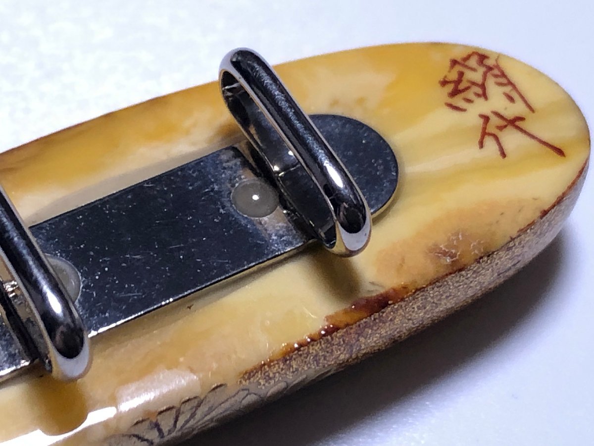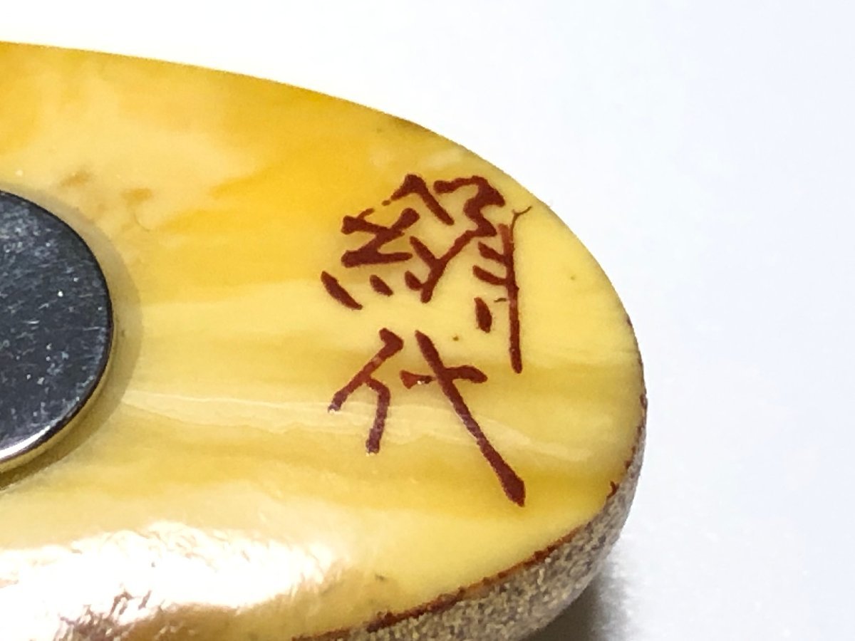 アンティーク、うるしアートはりや(HARIYA) のロイヤルアンバーを使用した、菊文の帯留めです。作者、針谷絹代の銘があります。状態良好です。