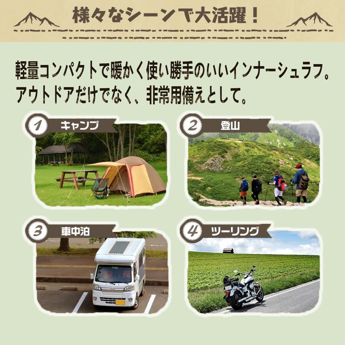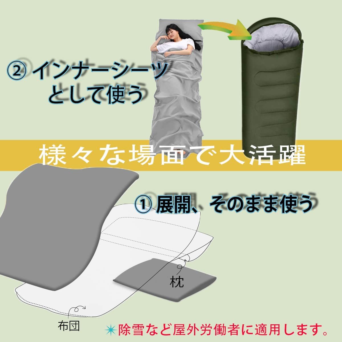 普段使い~キャンプ寝袋と多様性に優れたインナーシュラフです。 【丸洗い可&いつでも清潔】 皮膚に非常に優しい素材を採用し、吸水性・通気性に加え耐摩耗性を高い次元で両立、普通の棉より耐用性が良いポリエステルを使用し 普段使い アウトドア でも良質な睡眠へと導きます。 ファスナー仕様!取り付け 取り外しがラクチン!洗濯機で丸洗い可能なのでいつも清潔に保つことがでます。ベッドシーツと同様、インナーシュラフを寝袋の中に敷くことで寝袋を汚すことなく清潔な状態を保つ事ができます。 【持ち運びが簡単&底と側面開閉可能】 コンパクトにできる収納袋付きです!持ち運びや保管にも便利! 寝苦しい時や暑い時は簡単に温度調整可能です。側面は足を出すことができる設計になっており快適に安眠できます。 【様々な場面で大活躍】 アウトドア、キャンプ、登山、トラックでの仮眠用、ハイキング、旅行、車中泊、フィッシングだけではなく来客非常用。出張や会社団体旅行時にシーツの上に敷くなど様々なシーンでご利用いただけます。 地震などの防災用品として緊急避難用、いざという時の為にもお勧めの商品です。 商品詳細 商品名 インナーシュラフ 素材 100%ポリエステル サイズ 160×210cm ・80×210㎝、120×210㎝、160×210㎝ 3サイズ カラー レッド ・ピンク、レッド、水色、パープル、グレー、グリーンの6色 ご希望の色、サイズ等ございましたらお気軽に問い合わせ頂けたら幸いです。 #アウトドア #シュラフ #寝袋 #キャンプ #車中泊 #仮眠 #ベット #睡眠 #シーツ
