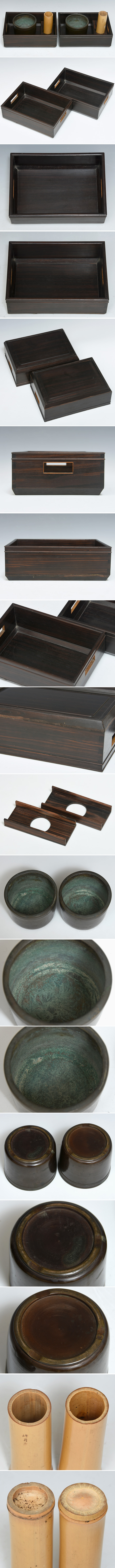 時代物の唐木煙草盆一双(2点セット)です。 硬く滑らかな木地が、落ち着いた雰囲気を醸しています。 火入・煙草入のセットです。 いずれも上質な付属品です。 箱含め古い物ですので、時代相応のスレや一部分木地の割れのような箇所などありますが、大きく目立った欠点はなくコンディションは良好です。 ※予めご了承の上ご入札お待ちしております。 ※撮影の際に生じた写り込みなどがございます。 ご理解の程よろしくお願い致します。 |