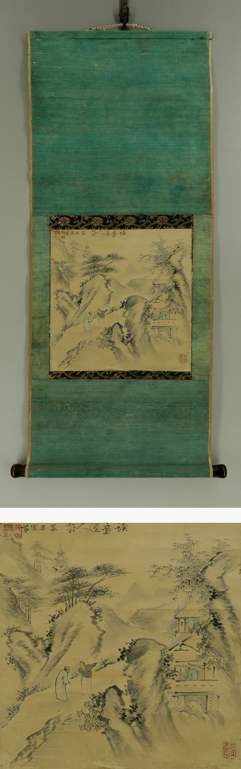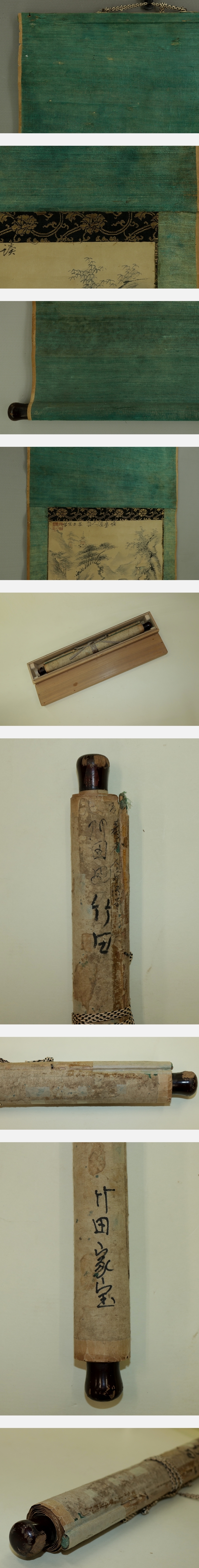 田能村竹田 たのむら-ちくでん(1777-1835) 江戸時代後期の画家。 安永6年6月10日生まれ。豊後(大分県)岡藩医の次男。藩校由学館の頭取となる。 藩内の農民一揆の際,藩政改革の建言がいれられず隠退。 絵を谷文晁らに学び,繊細な筆致の独自の画風を確立。幕末文人画壇の代表的な作家。 頼山陽らと親交を持ち,詩や書にも優れた。天保6年8月29日死去。59歳。 名は孝憲。字は君彝。通称は行蔵。 本紙は、染み、汚れ、強い折れ、強い皺、虫食い、擦れ、ヤケ、破れ、 修理痕があります。 表装は、染み、汚れ、強い折れ、皺、虫食い、破れ、ほつれ、剥れ、 修理痕、軸先に汚れと傷があります。 【サイズ】 作品 横約28.5cm×縦約29.5cm 表装 横約37.5cm×縦約91.5cm |