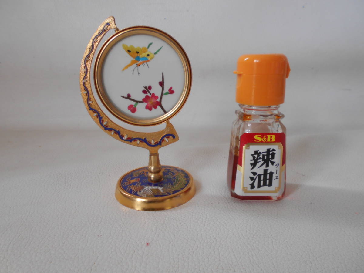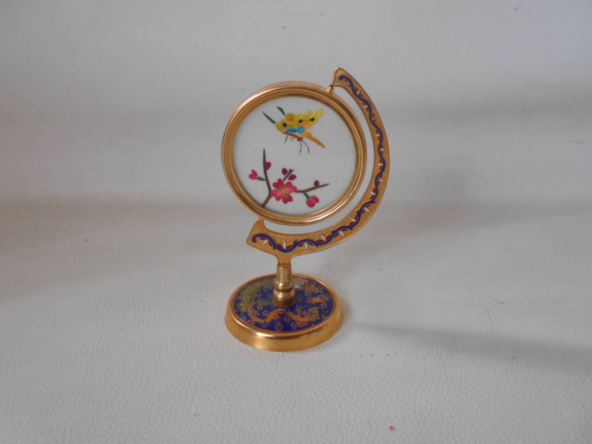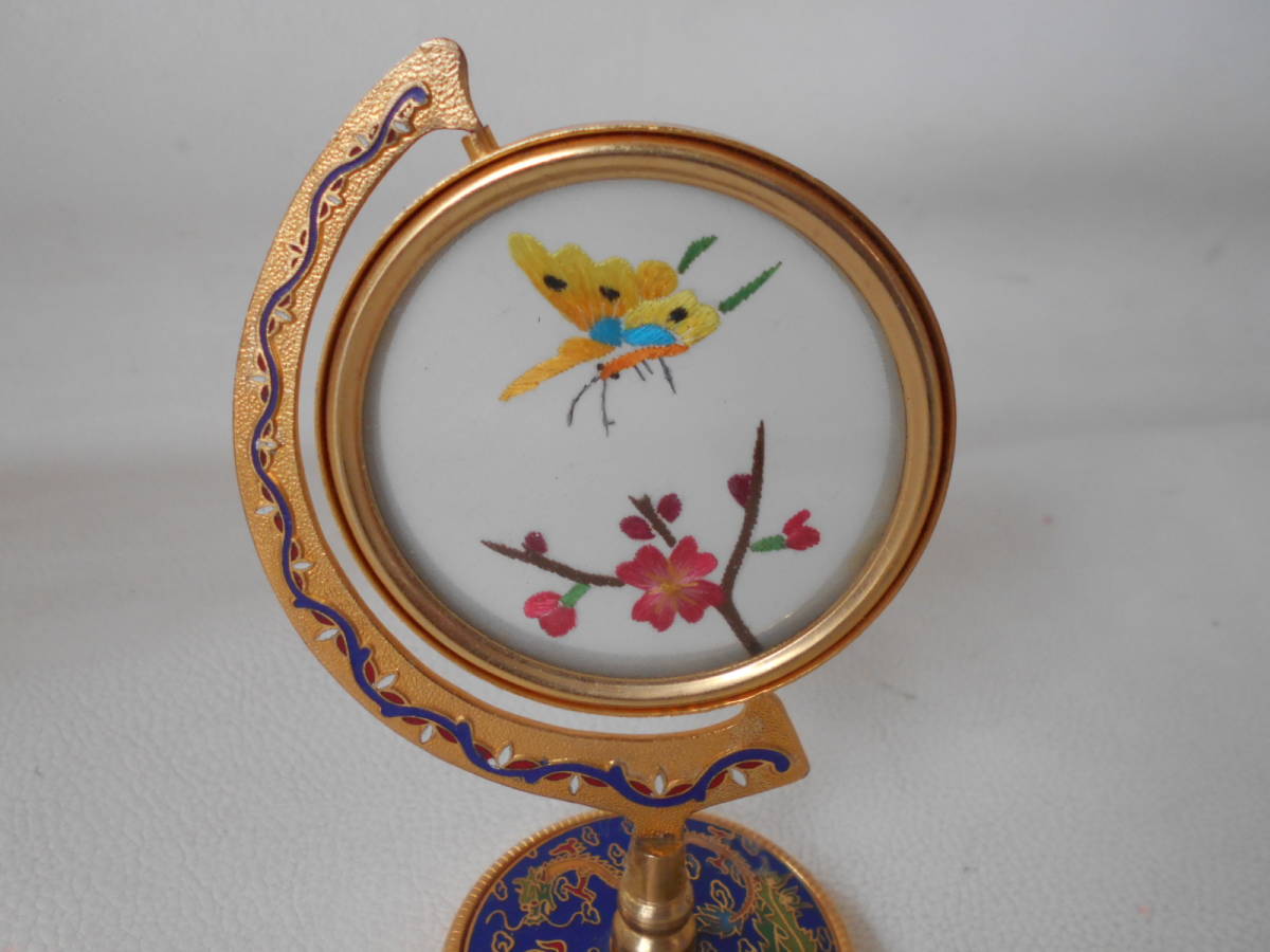中国 刺繍 両面刺繍 ガラスの刺繍 蝶々 梅 縁起物 床の間 ミニチュア 地球儀型 底部 七宝焼き 龍 鳳凰 中国工芸品 中古品
