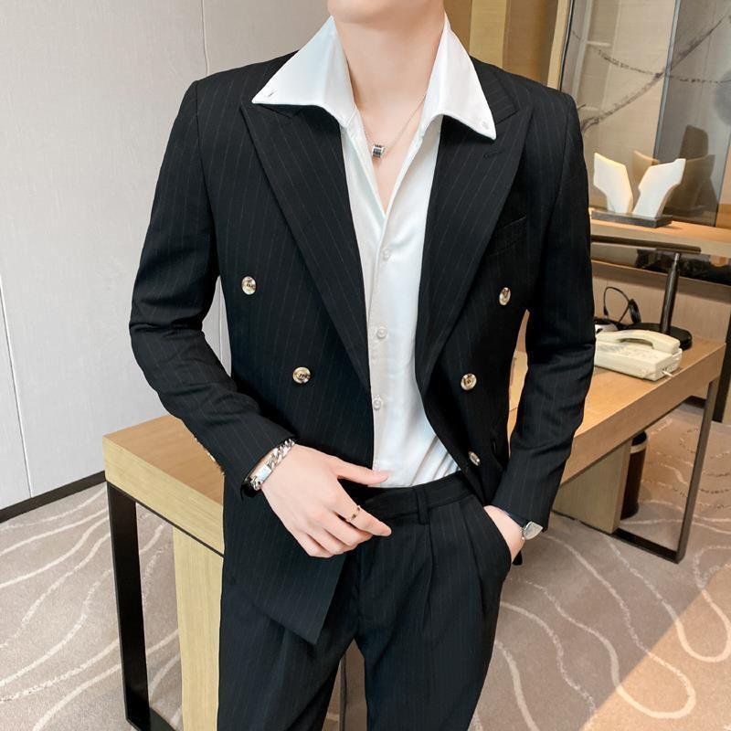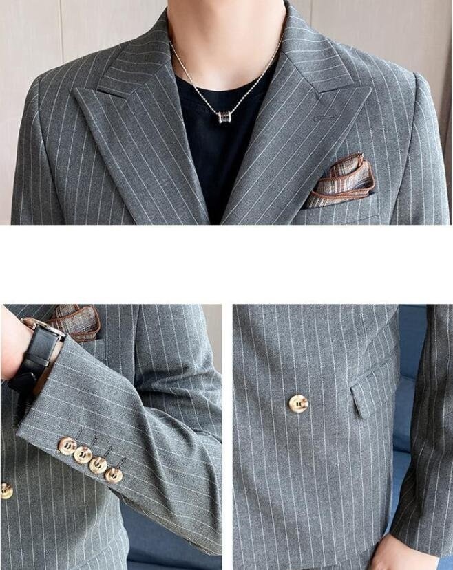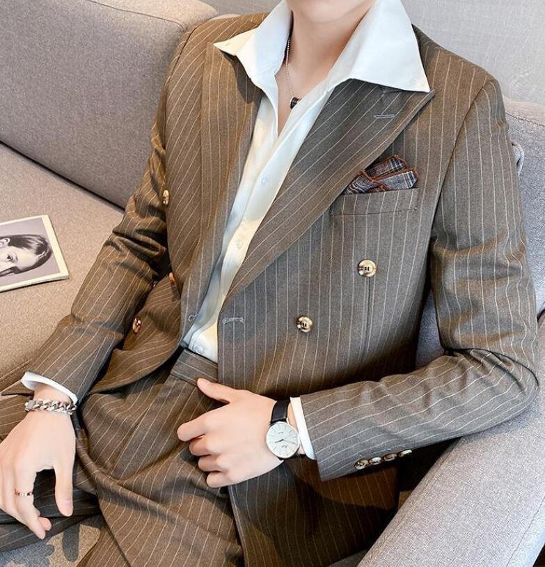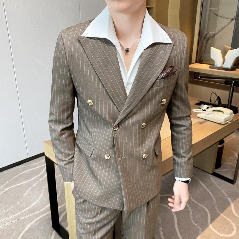 超希少 スリーピース 新品 メンズ ストライブ柄 ダブルスーツ ビジネススーツ セットアップ 超華奢 スリム 紳士服 通勤 結婚式 珈琲 M~3XL