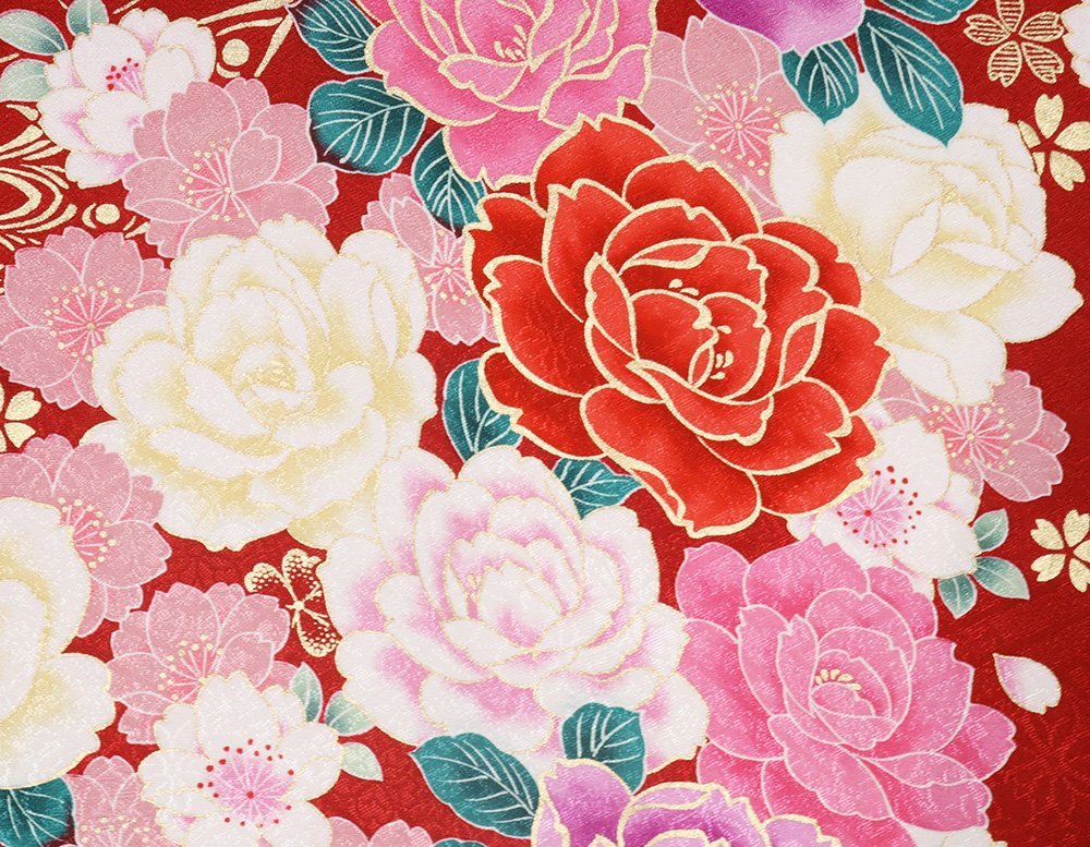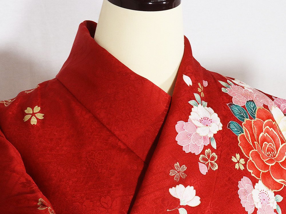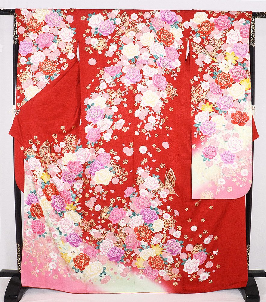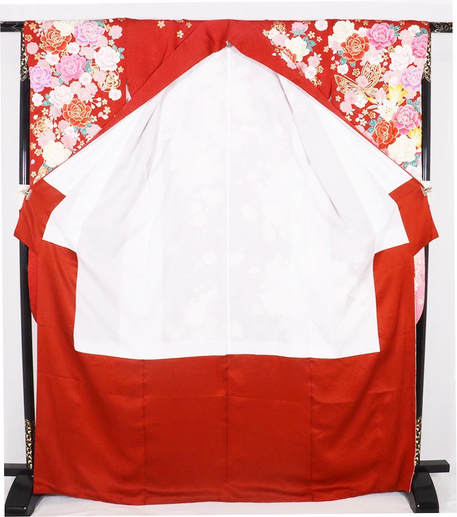 本振袖 袷 丹後縮緬地 赤地 薔薇・桜・蝶 176 広襟 | |