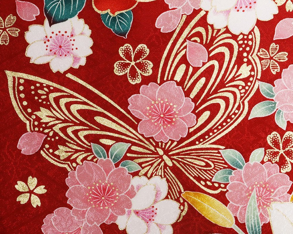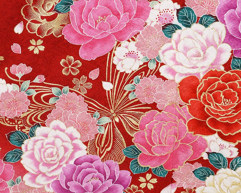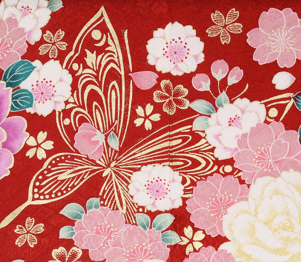 色・柄 | 本振袖 袷 丹後縮緬地 赤地 薔薇・桜・蝶 (写真では上手く色が出ない場合があります。ご了承下さい) 写真の枚数が多いので一度パソコンでご覧ください。 |