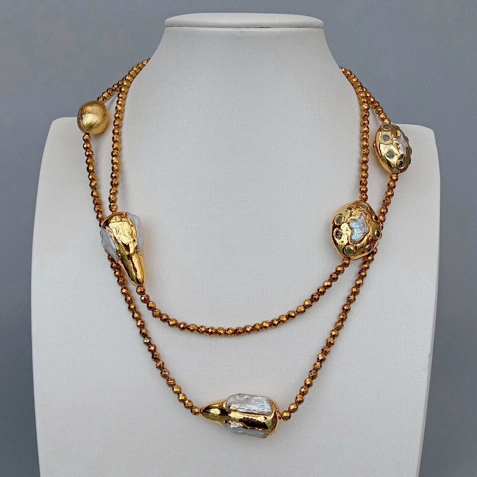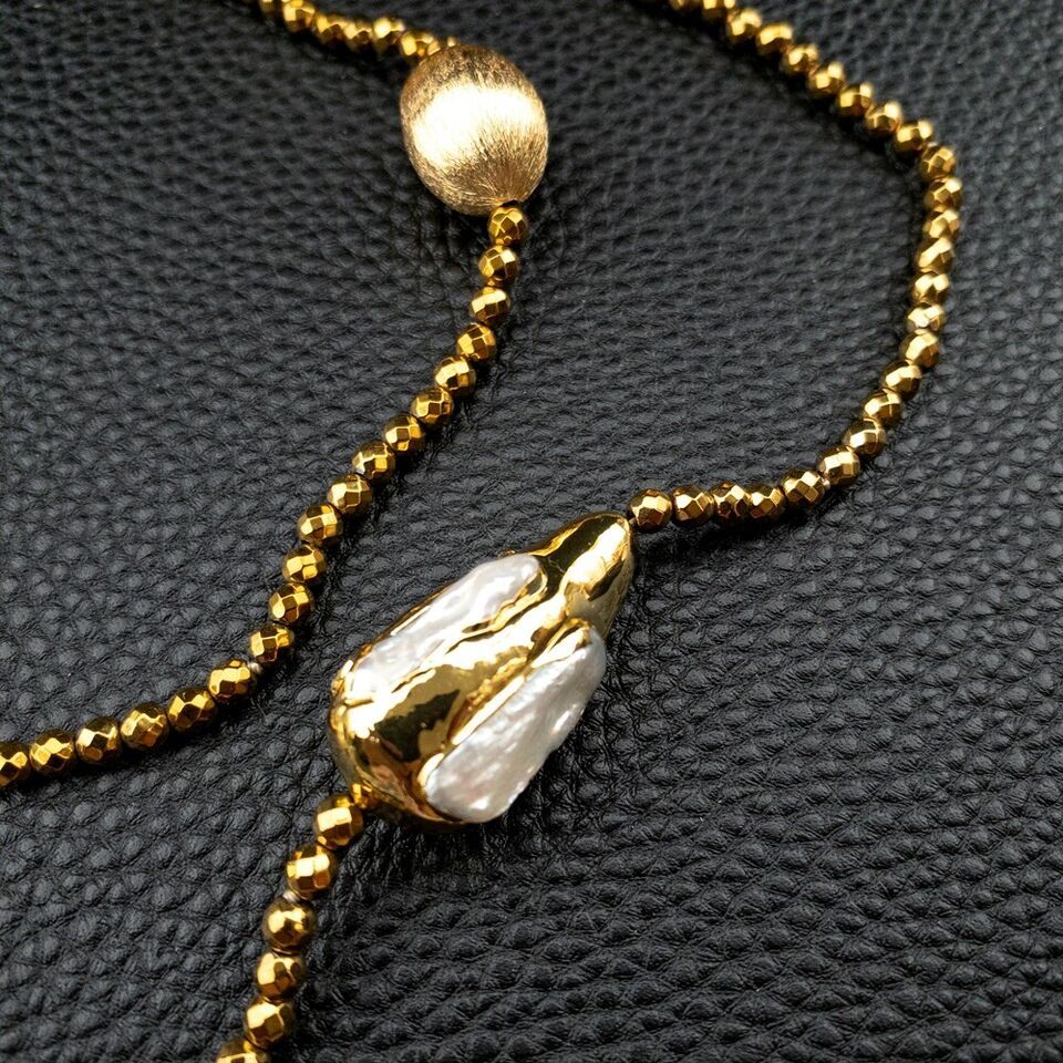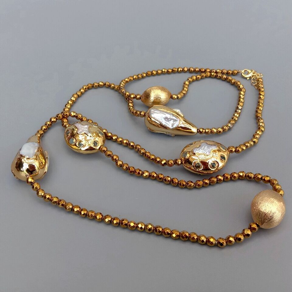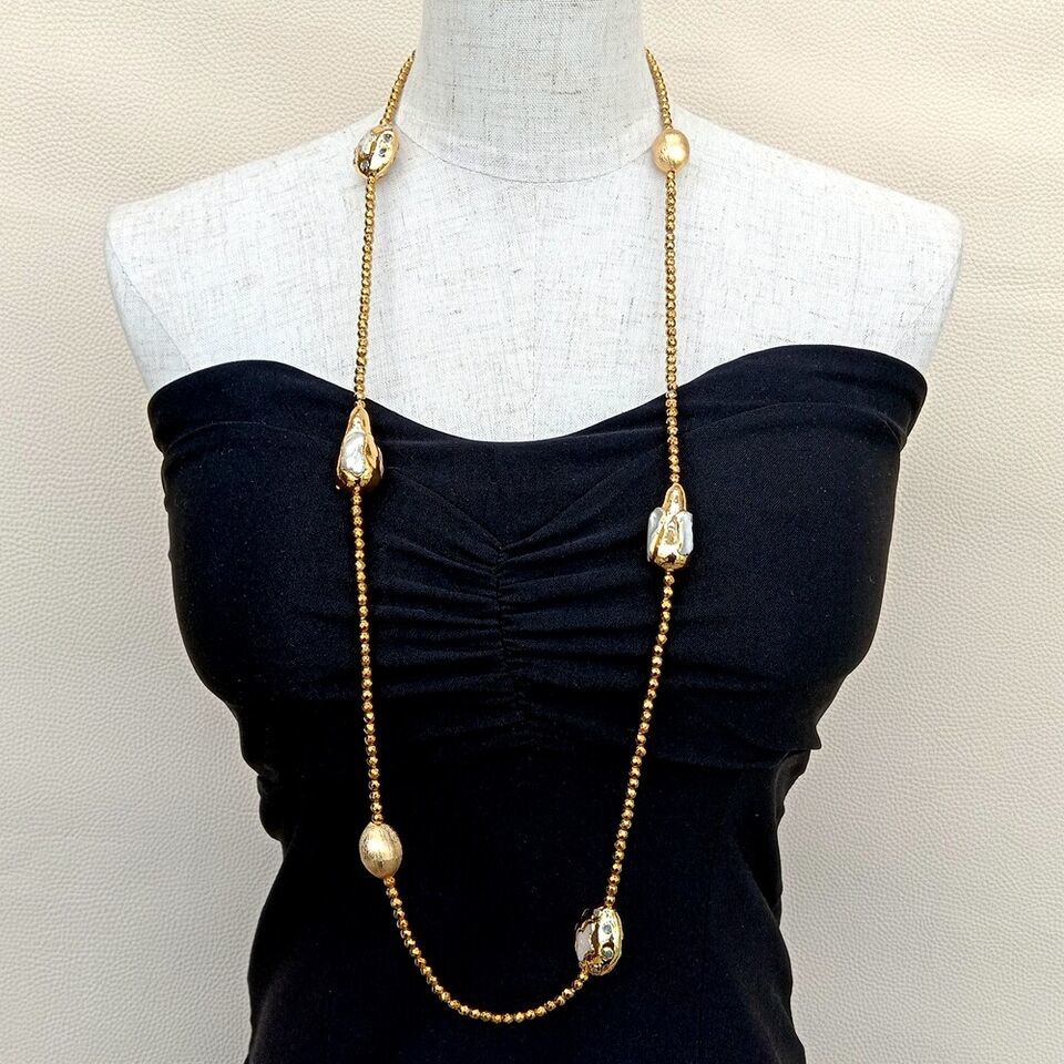 <新品>ホワイト 淡水養殖 パール 真珠 ゴールド ヘマタイト 37インチ 約94cm ロング 長い ネックレス 結婚式 プレゼント パーティー