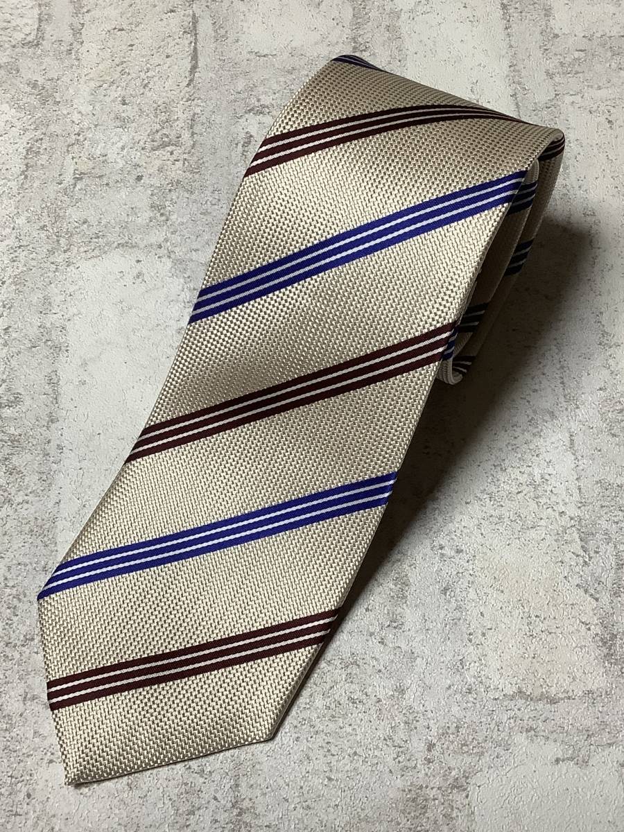 新品未使用 ノーブランドだから安い 日本製ネクタイ  シルク100%お買い得サービス 明るいベージュ 茶とブルーラインのストライプ