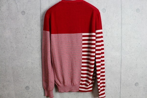 左右のボーダーを切替えているパネルボーダーニットで、後ろ身頃に至るまで柄に変化を出しているのが最大の特徴のニットです。