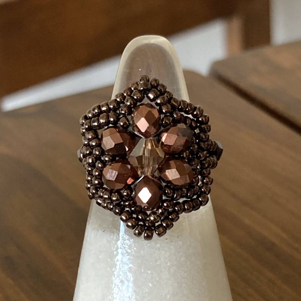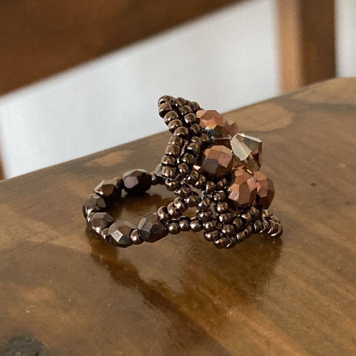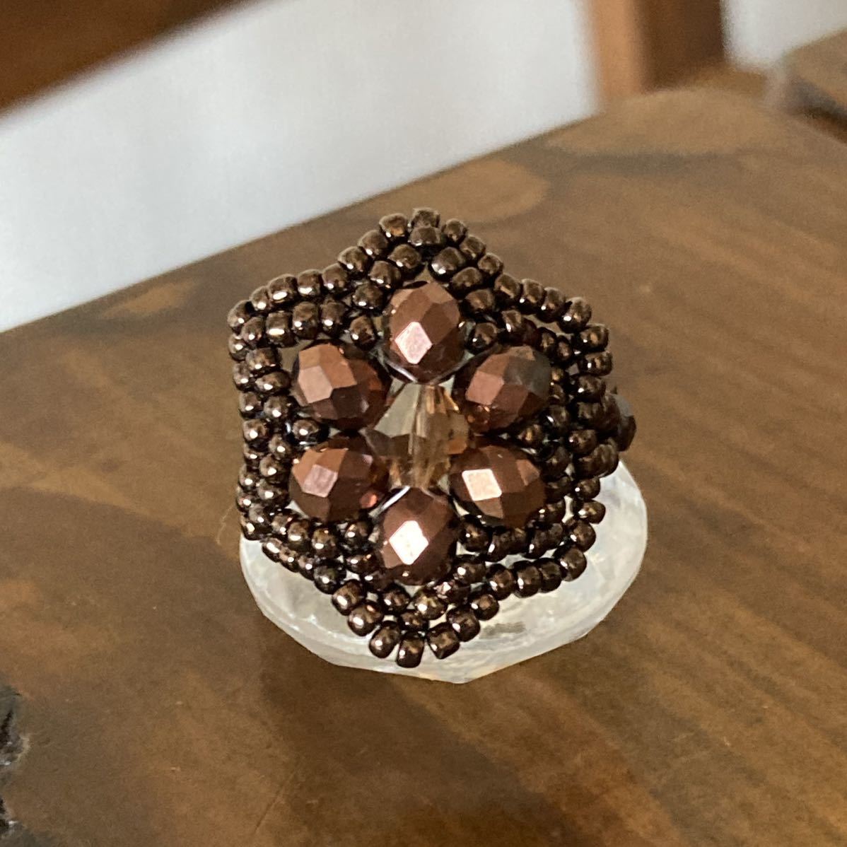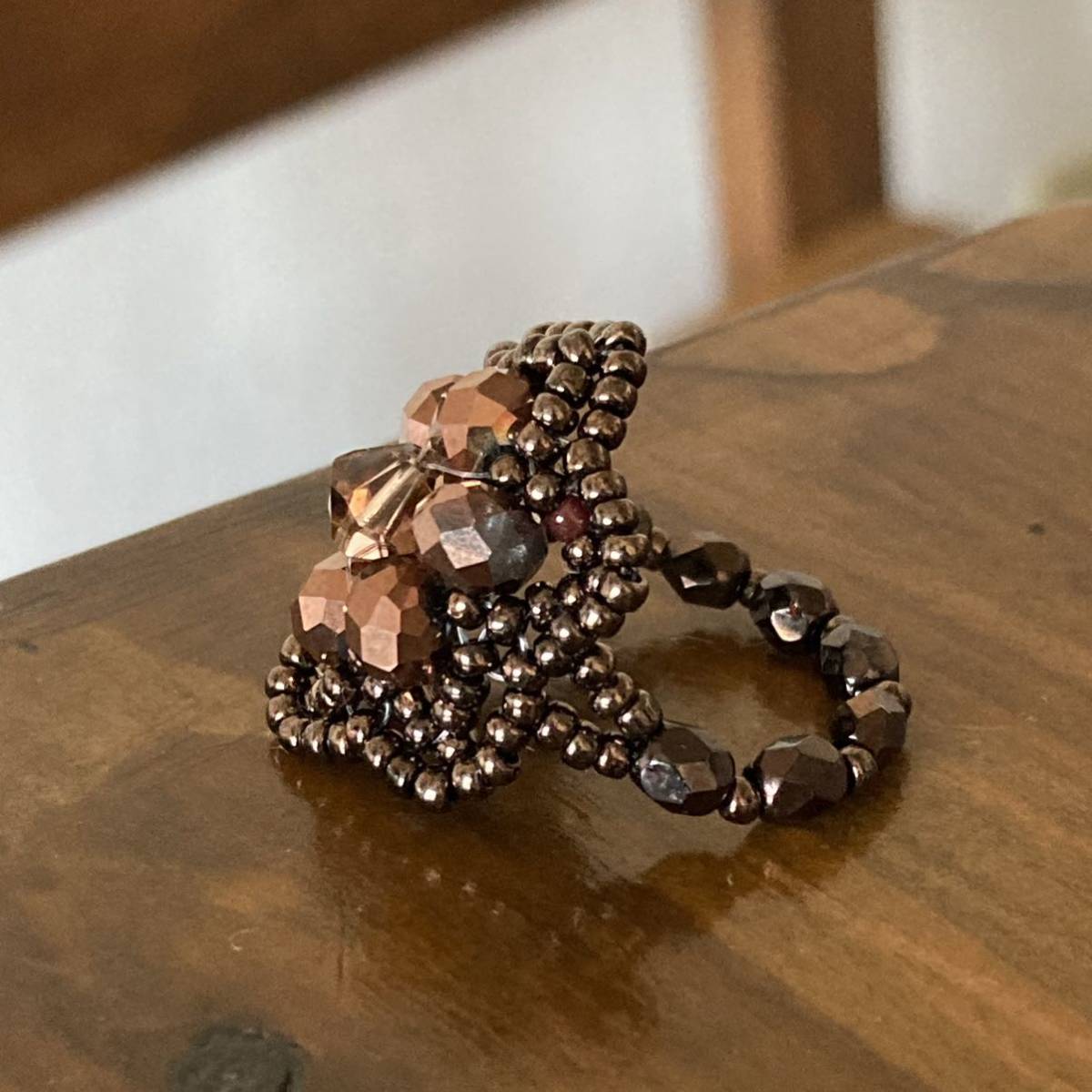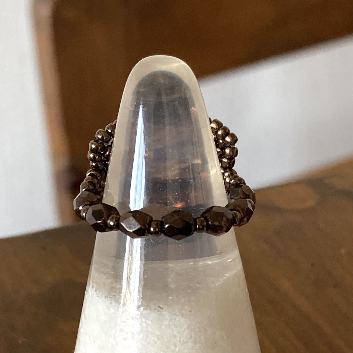 6mmのブロンズのボタンカットビーズ、中央に6mmのクリアブラウンのソロバンカットビーズ、4mmのブロンズのチェコビーズ、ブロンズの丸小ビーズで作ったリングです。
