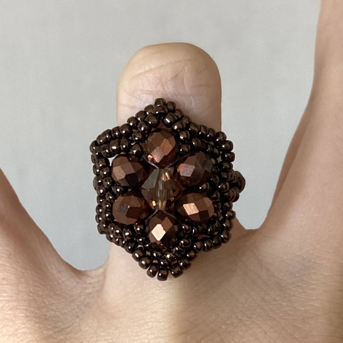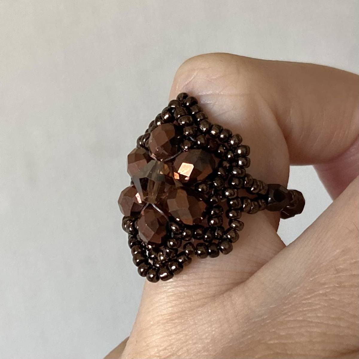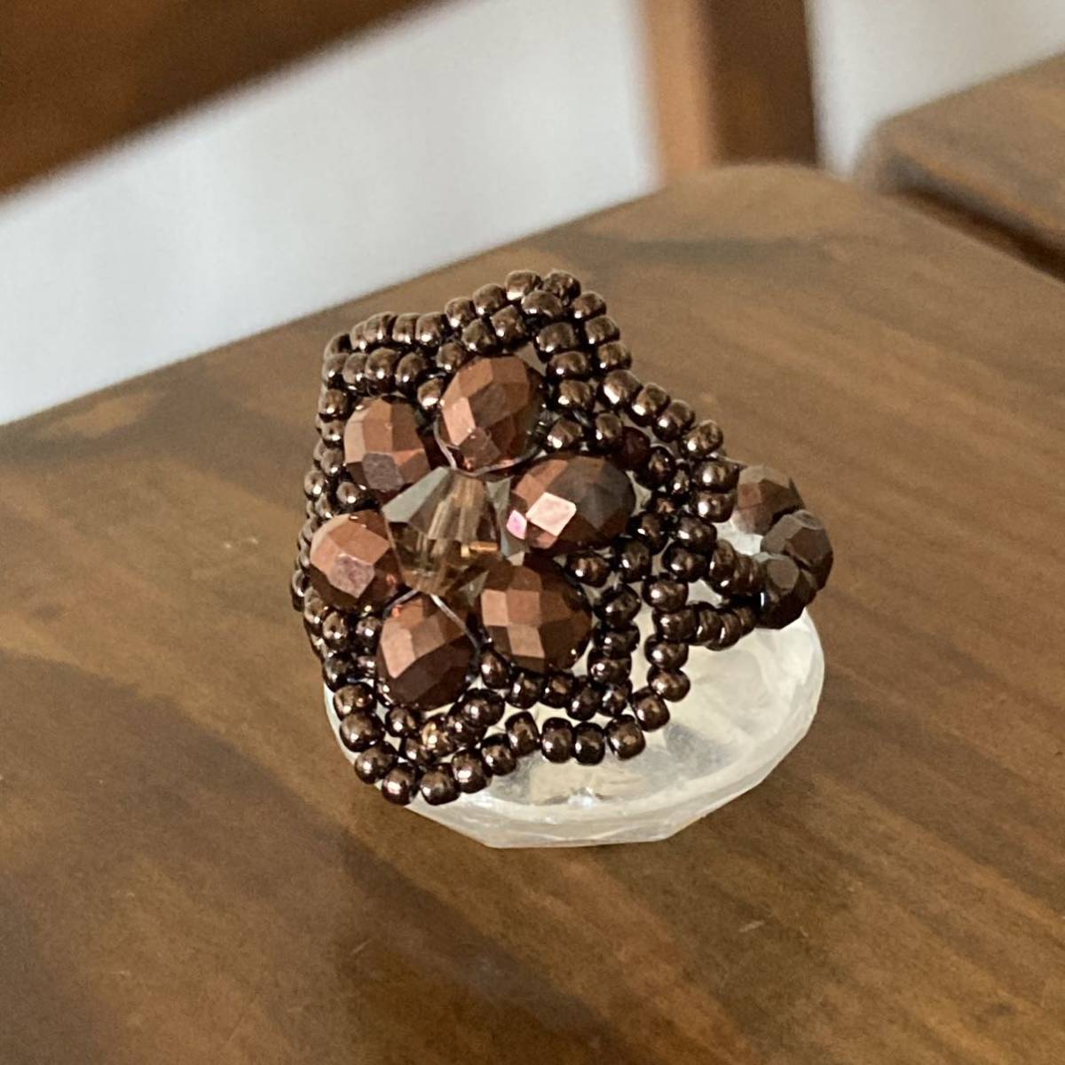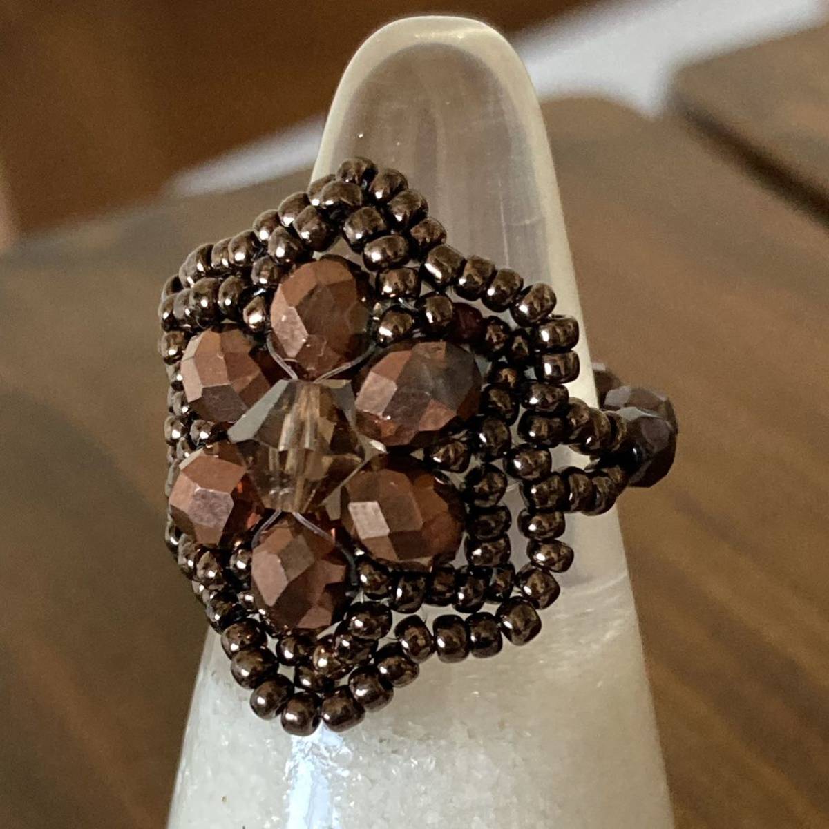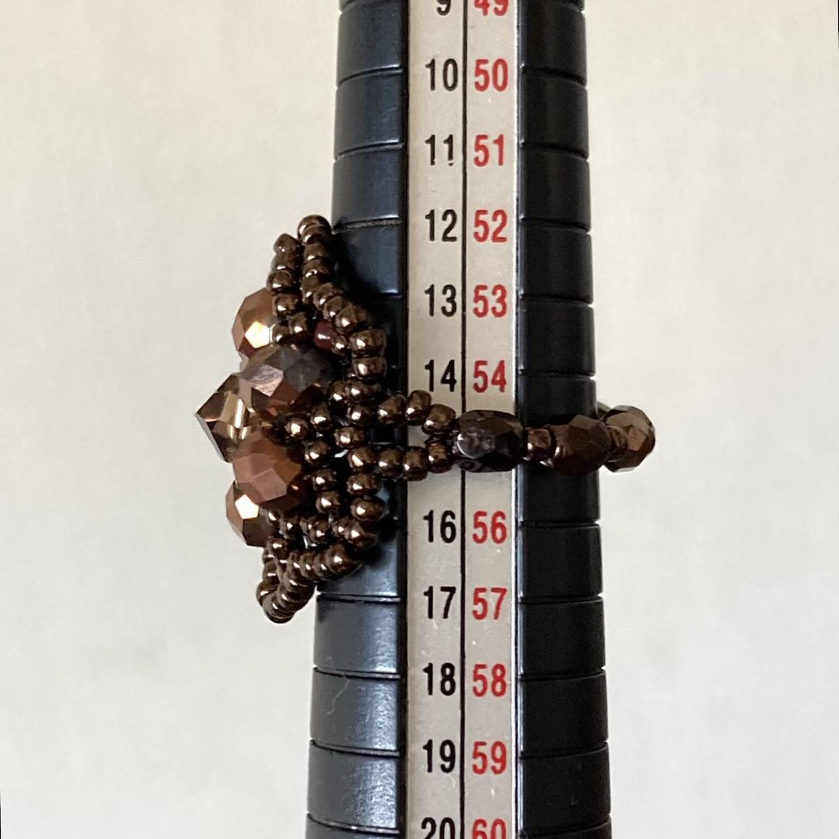 6mmのブロンズのボタンカットビーズ、中央に6mmのクリアブラウンのソロバンカットビーズ、4mmのブロンズのチェコビーズ、ブロンズの丸小ビーズで作ったリングです。