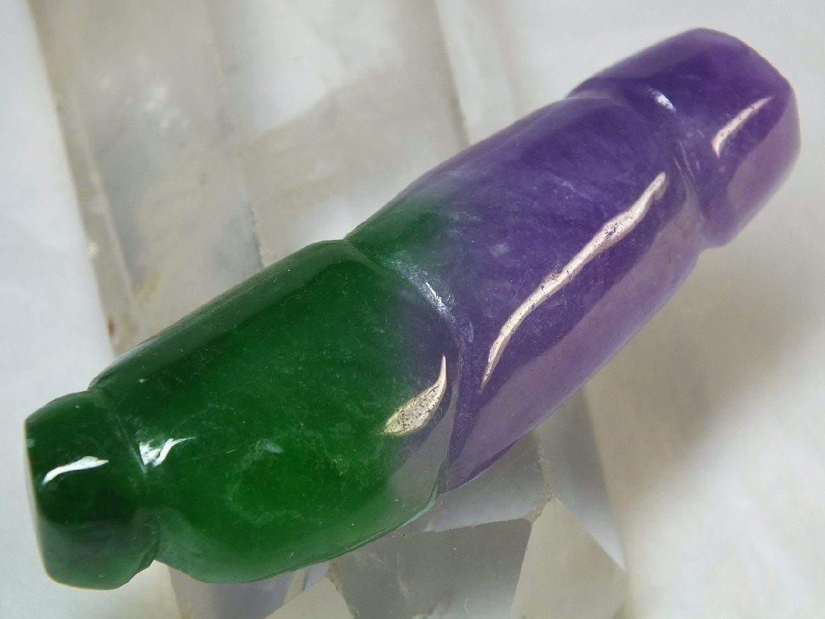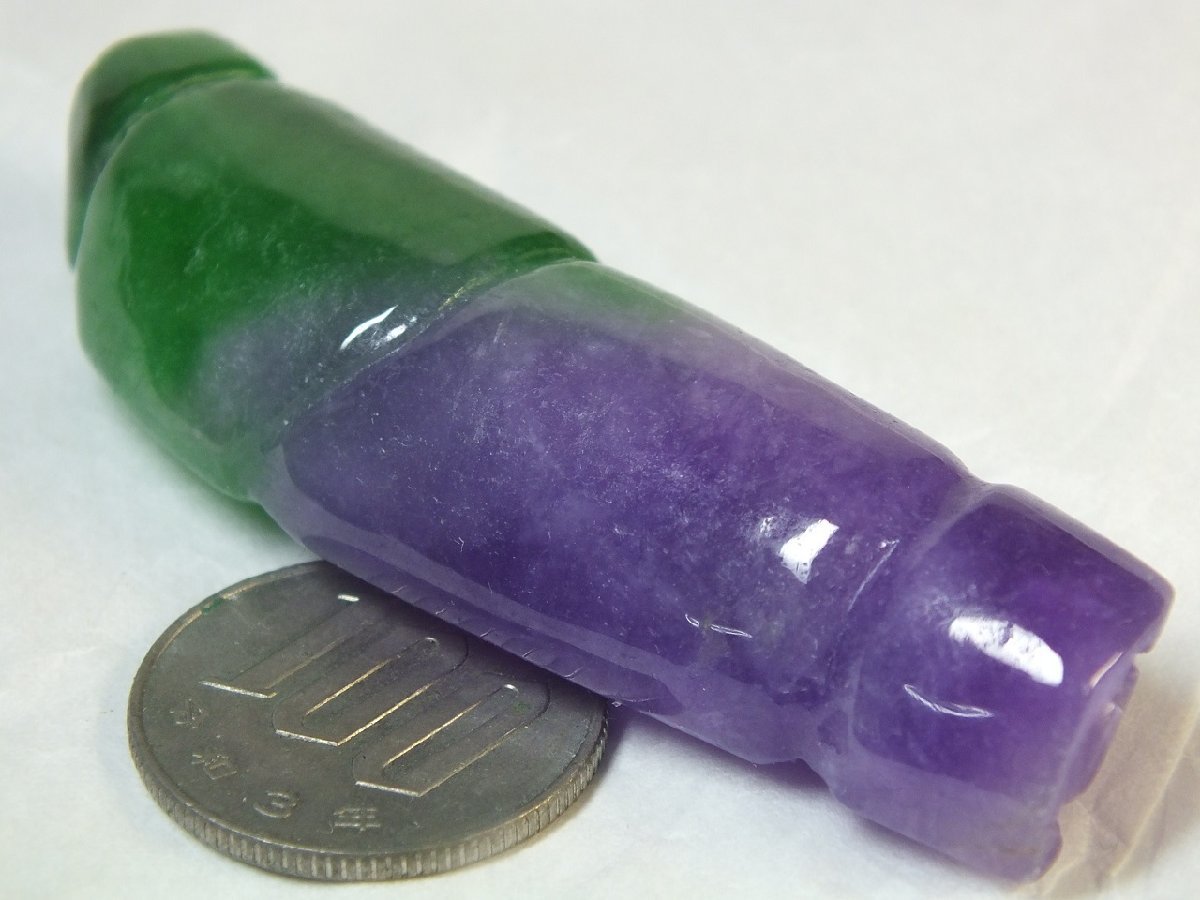 ▲商品説明▲ | サイズ:73×23×13mm 重さ:45.7g 緑色が綺麗なミャンマー翡翠。仄かにラベンダー色も混ざった珍品です。縁起柄の蓮根が彫り込まれています。石コレクションやお守りに。上部に貫通穴が有るのでペンダントトップや下げ飾りにもなります。 ☆商品につきましては注意を払った検品を行っておりますが、稀に石の表面にクラック状の筋や浅い凹みが見受けられる場合が御座います。それは石本来の石紋で傷ではありません(割れが生じ易いヒビではありません)。返品の対象にはなりませんのでその旨御了承の上、ご検討下さい。 |