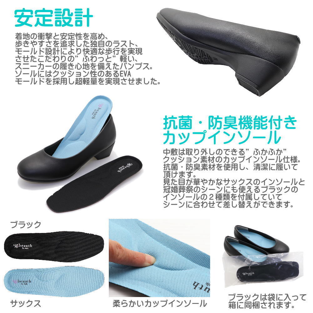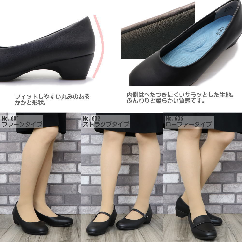 出品の色/サイズ No.601プレーンタイプ/ブラック/24.0cm 注)デザイン色サイズ別に出品していますので落札後の変更は出来ません必ずご希望のデザイン色サイズにご入札をお願いします *送料は地域別になります、スマートフォンご利用の方は下段「ストアの情報」よりご覧ください。 下記URLからご覧頂けます http://auctions.yahoo.co.jp/html/profile/cxyqt422.html 注)オークション終了後、店舗からのメールが届くまでご決済はお待ち下さい。 ■□ 雨の日も安心!2cm防水設計の疲れにくいブラックパンプス □■ 着地の衝撃と安定性を高め、歩きやすさを追求した独自のラスト、モールド設計により快適な歩行を 実現させたこだわりの”ふわっと”軽い、スニーカーの履き心地を備えたパンプス。 フォーマルな場所にもぴったりなスクエアトゥーラストのトップ部分をあえてラウンドにし、つま先の圧迫感を緩和 長時間履いても疲れにくく足が痛くなりにくい、こだわりのラスト設計。 静水につけた状態で設置面より2cm、3時間の防水テストに合格。防水シートを内蔵しているので雨の侵入を最低限に抑えます。 中敷は取り外しのできる”ふかふか”クッション素材のカップインソール仕様。抗菌・防臭素材を使用し、清潔に履いて頂けます。 見た目が華やかなサックスのインソール+冠婚葬祭のシーンにも使えるブラックのインソールの2枚組。 シーンに合わせて差し替えができます。 |