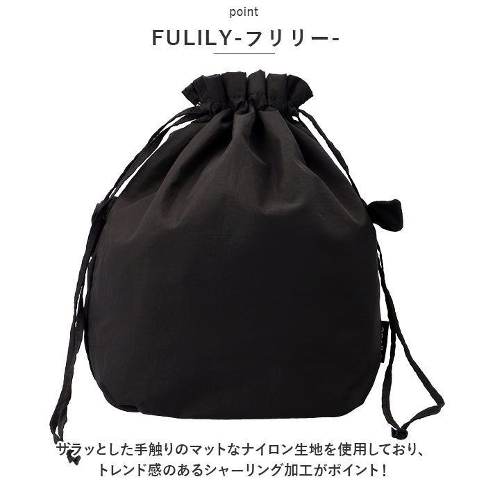 商品説明 | ・・anelloGRANDEのフリリーシリーズから、デイリー使いにぴったり。2WAYショルダーが新登場。 ・【FULILY-フリリー-】 ・サラッとした手触りのマットなナイロン生地を使用しており、トレンド感のあるシャーリング加工がポイント! ・【持ち方を選べる2wayタイプ】 ・手持ちの巾着として持つのも良し、口折りショルダーとしても使用可能。ショルダーは結び目を変えることで長さ調節でき、お好みに合わせてスタイルチェンジ。 ・【手軽に持ち出せるアイテム】 ・体に負担がかかりにくい軽量設計。コンパクトながらお出かけのマストアイテムが収まるサイズ感で、身軽にお出かけしたい日にぴったり◎ ・【安心の巾着仕様】 ・開口部は紐をキュッと絞る巾着式。中身のこぼれ落ちを防ぎ、プライバシー面も安心。 ・【A5サイズもペットボトルも】 ・内側は、A5サイズのノートや500mlペットボトル対応サイズ。長財布やミニポーチなども収納OK。 ・【小物が迷子になりにくい!】 ・ファスナー式の内ポケットには、細々した物や貴重品をIN。バッグの中で探す手間が省け、必要な時にすぐに取り出せる♪ ・【ちょっとの雨なら大丈夫】 ・表面に水滴や汚れを弾く撥水加工済みで、お手入れも拭き取るだけ!(※完全防水ではありません。) ・【どんなスタイルにもマッチ】 ・くすみカラーを中心としたバリエーション。様々なコーデに合わせやすく、ファッションのアクセントに☆ ・【ポケット仕様】 ・内側:ファスナーポケット×1 |