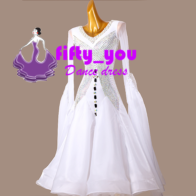 新品fifty_you レディース社交ダンスドレス  モダン競技エレガントデザイン セミオーダー ストーン+玉飾り スタンダードドレス 白色