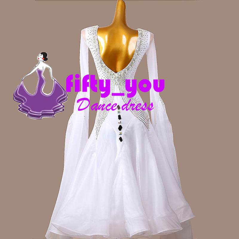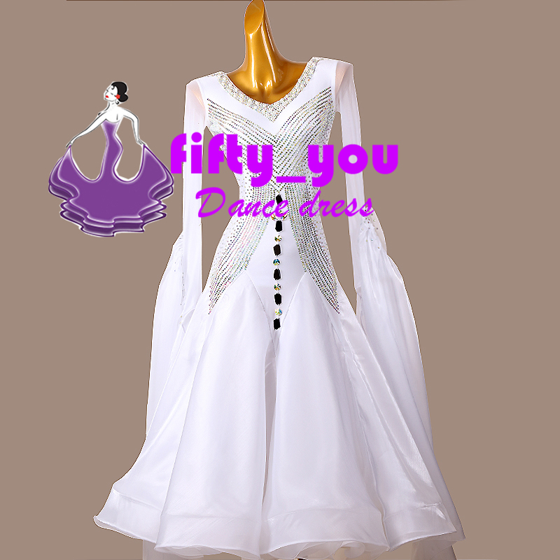 新品fifty_you レディース社交ダンスドレス  モダン競技エレガントデザイン セミオーダー ストーン+玉飾り スタンダードドレス 白色