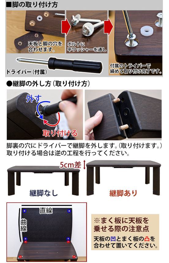 オールシーズン使用できるこたつです 5cmの継脚付きで、高さ38.2cmを43.2cmに変えられます