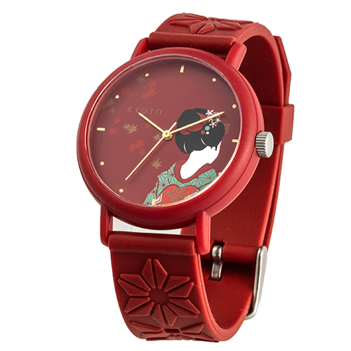舞妓の魅力の一つでもある、華やかなかんざしや髪飾り、だらり帯や和傘などを、赤や朱色などの鮮やかな色を使用し季節の移ろいが織りなす、美しさを表現いたしました。