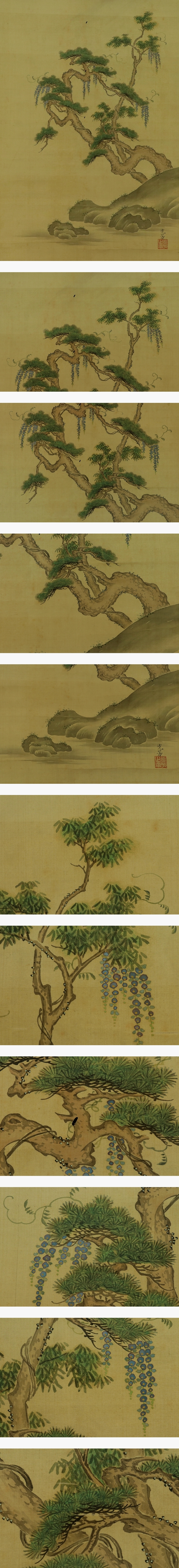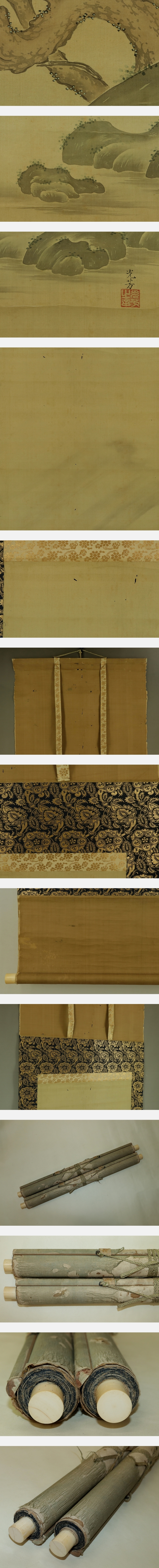 土佐光芳 とさ-みつよし(1700-1772) 江戸中期の土佐派の画家。光祐の子。幼名は藤満丸。 大蔵少輔・弾正少忠・左京少進を歴任する。元文三年の大嘗会に悠紀主基の御屏風を執筆。 延享三年官を辞し、落髪して法名を常覚という。 明和9年(1772)歿、73才。 本紙は、染み、汚れ、強い折れ、皺、破れ、ほつれ、ヤケがあります。 表装は、染み、汚れ、強い折れ、皺、虫食い、破れ、ほつれ、剥れ、ヤケ、 軸先に汚れとヒビがあります。 【サイズ】 作品 横約41.5cm×縦約108cm 表装 横約54.5cm×縦約196cm |