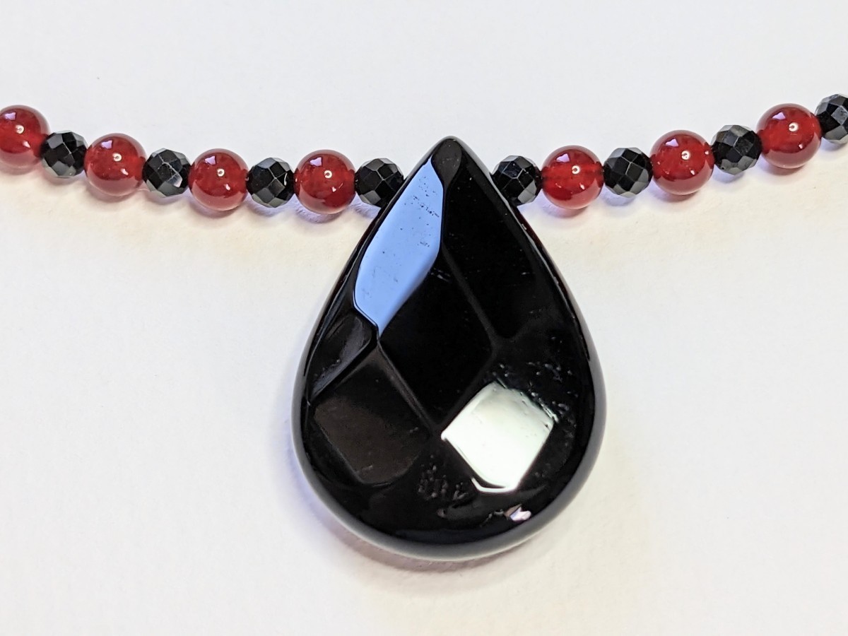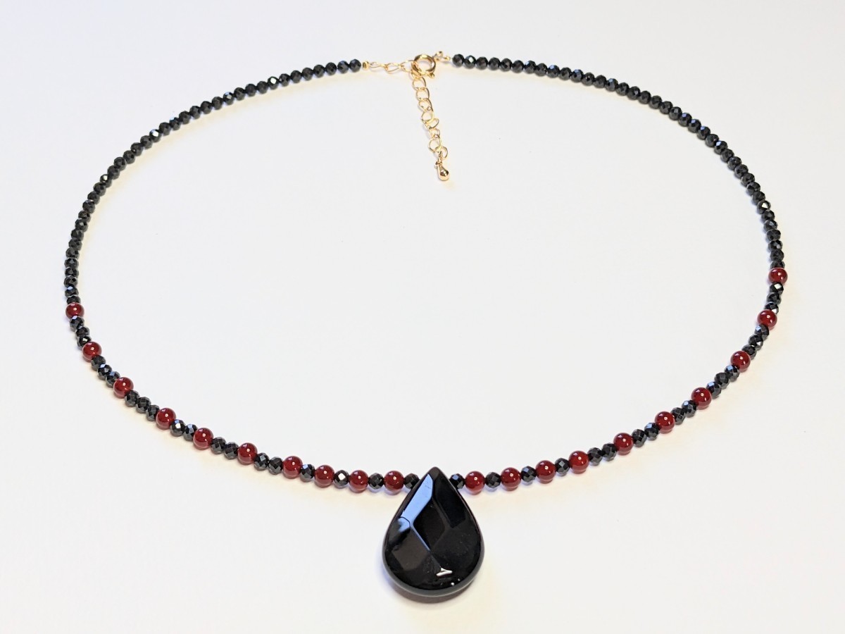 【数量限定になります】 使用石 : 天然ブラックオニキス(正式名称:ブラックカルセドニー) 染色処理) 約30×20mm 天然ブラックスピネル 約3mmカット キラキラ輝きます 天然赤瑪瑙(染色処理) 約4mm 金具 : 引き輪式 アジャスター約5cm 真鍮製(メッキ加工) 長さ : 約50cm(アジャスター約5cm含む) 天然石由来のクラックやインクルージョンが、わずかに確認できる玉もあります。 | |||
