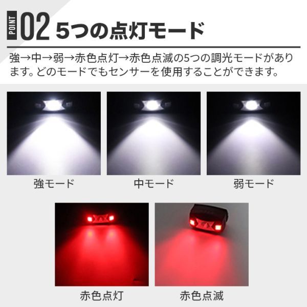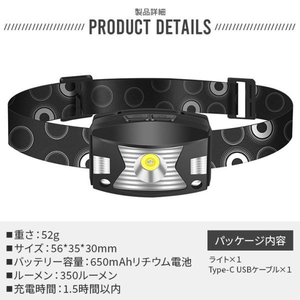 進化版XPG LEDヘッドライト 充電式ヘッドランプ センサー機能5段階調光 SOS機能 350ルーメンiPX67防水 52g 軽量 充電インジケータTYPE-C 充電 黒