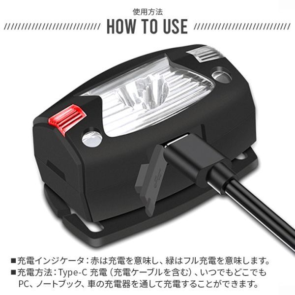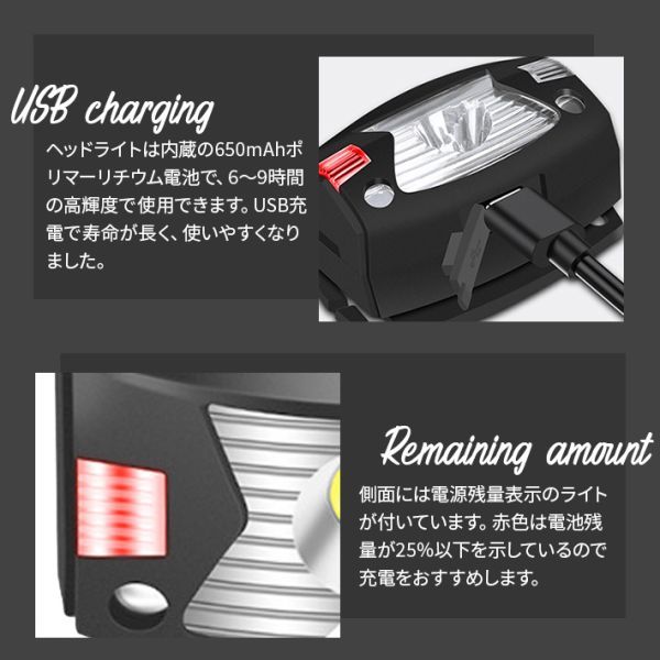 このヘッドライトは内蔵の650mAhポリマーリチウム電池を使用して、6-9時間の高輝度で点灯することができます。USB充電方式を採用しており、寿命が長く、利便性が向上しています。側面には電源残量表示のライトも搭載されており、赤色表示は電池残量が25%以下であることを示しています。充電をおすすめします。