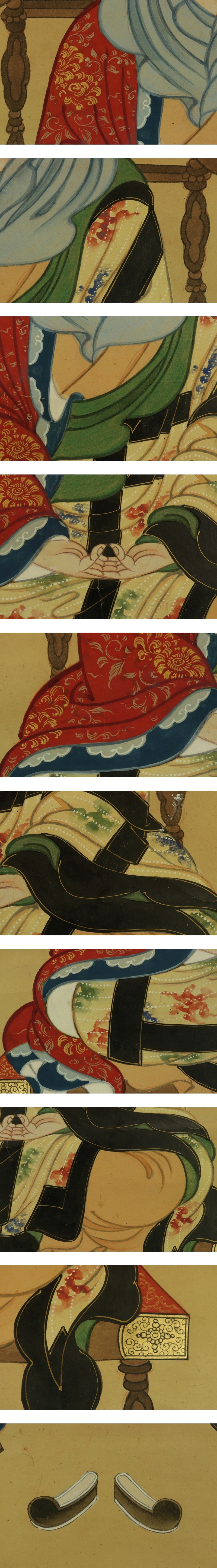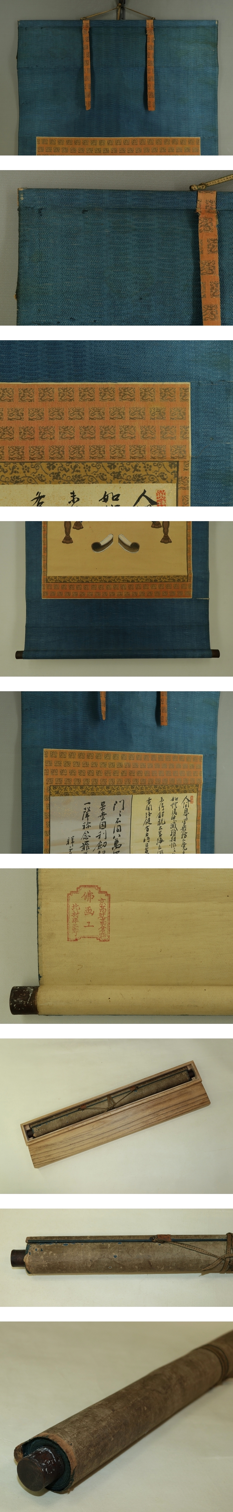 | 商品について | 古仏画【最澄像】 本紙は、染み、汚れ、強い折れ、皺、ヤケがあります。 表装は、染み、汚れ、折れ、皺、虫食い、破れ、ほつれ、剥れ、風帯に傷み、 軸先に汚れと変色、軸紐に劣化があります。 【サイズ】 作品 横約41cm×縦約102.5cm 表装 横約54cm×縦約169cm |