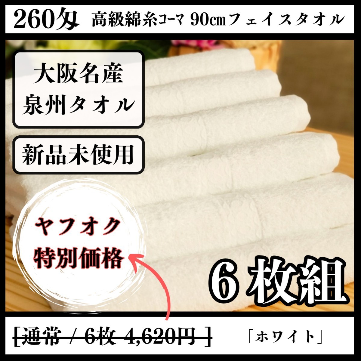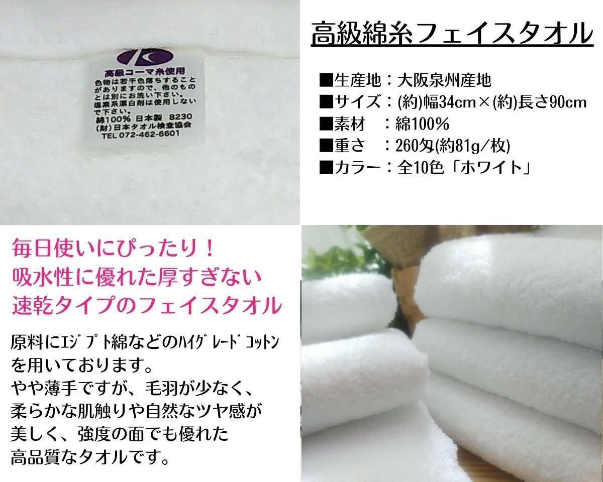 【泉州タオル】260匁高級綿糸コーマ90cmフェイスタオルセット6枚【ホワイト】タオル新品 優しい肌触り まとめ売り 吸水性抜群